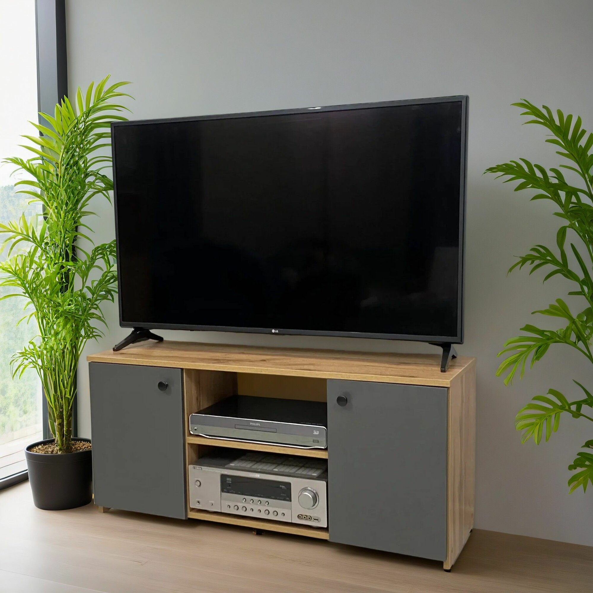 Тумба под телевизор напольная Смайл ТВ с доводчиками, с полками, с дверцами, закрытая, 111х34х51см, бежевая, Дуб Сонома