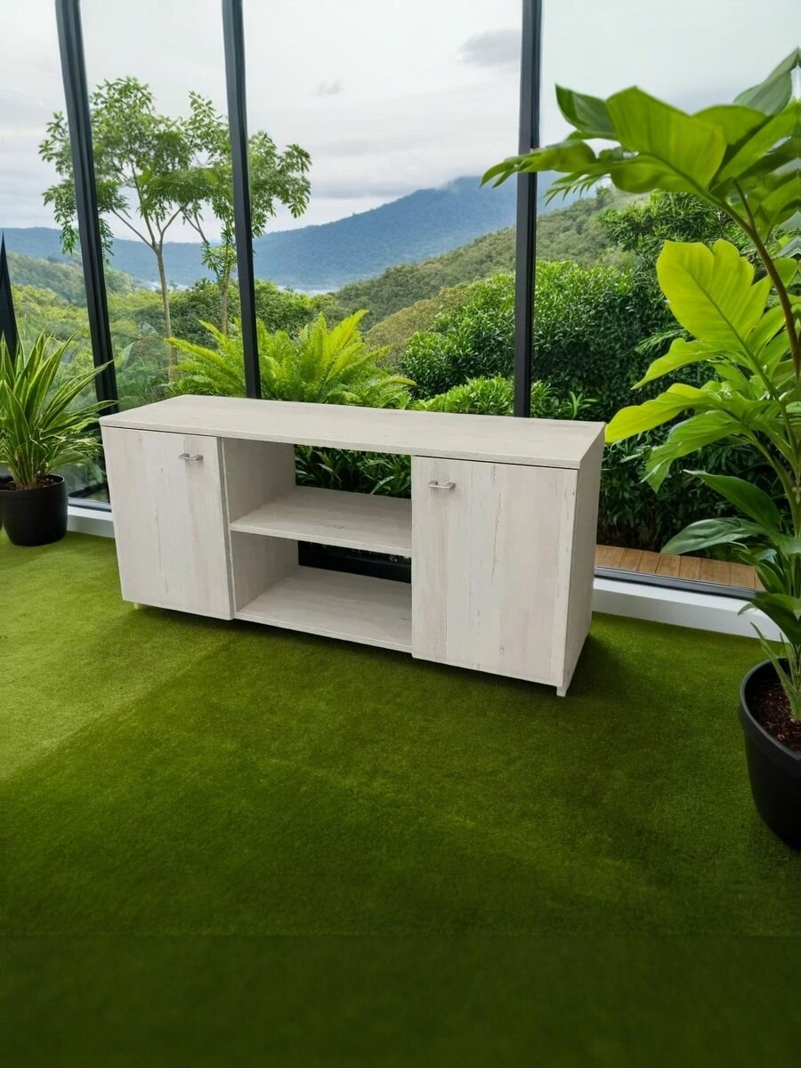 Тумба под телевизор напольная Смайл ТВ с доводчиками, с полками, с дверцами, закрытая, 111х34х51см, Белый Шагрень/Бетон