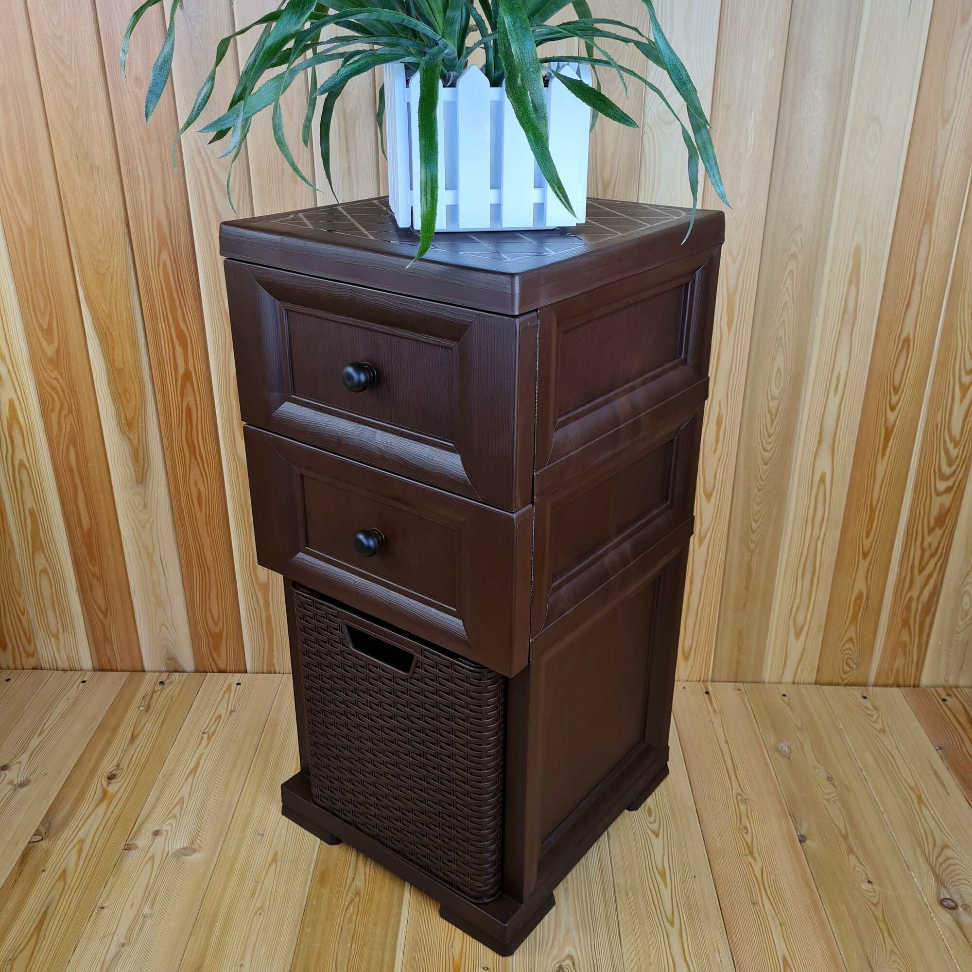 Тумба-комод, пластиковая с усиленными рёбрами жёсткости, "УЮТ", 2 сплошных ящика + 1 бежевая плетёная корзина снизу.