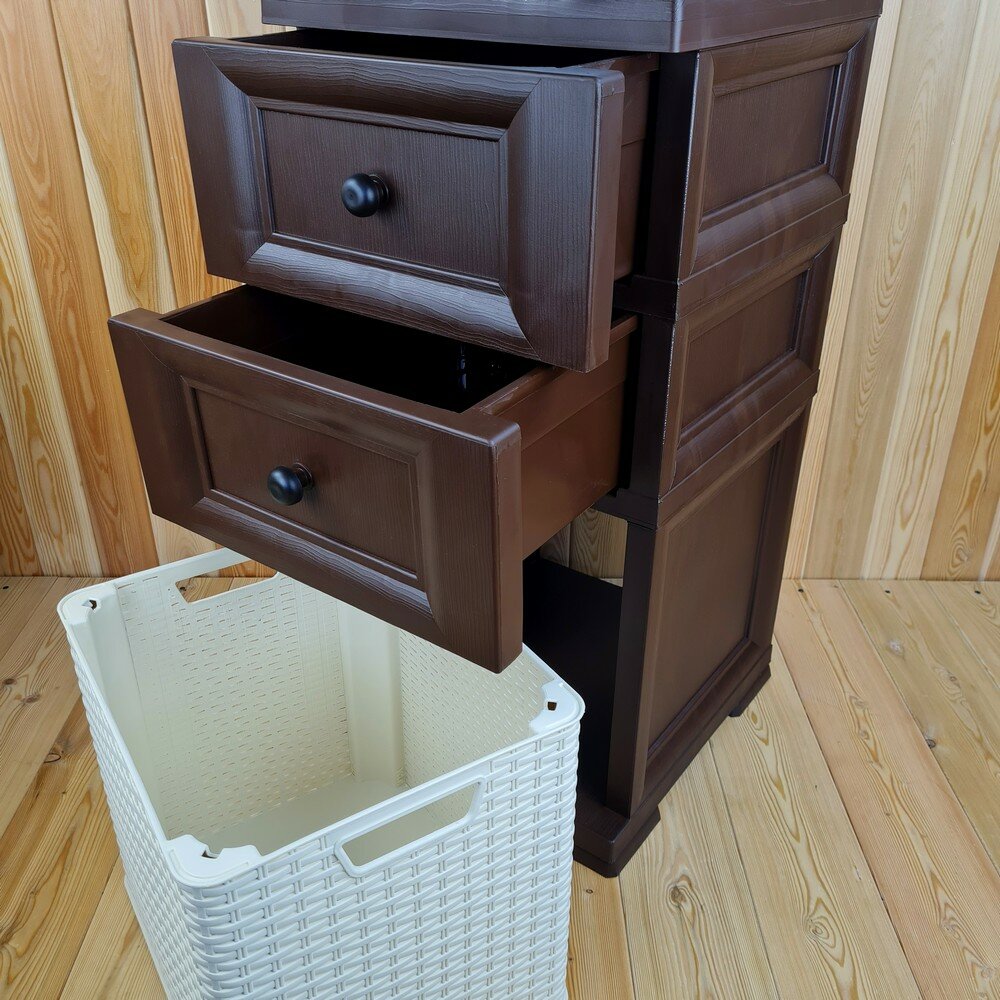 Тумба-комод, пластиковая с усиленными рёбрами жёсткости, "УЮТ", 2 сплошных ящика + 1 коричневая плетёная корзина снизу.