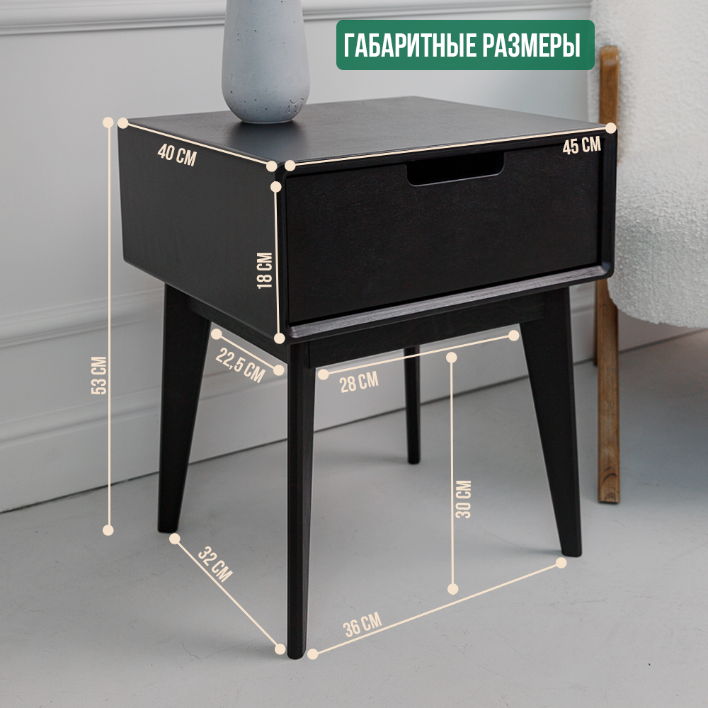 СохранитьТумба прикроватная из дерева с выдвижным ящиком на ножках напольная деревянная (как IKEA) в спальню, прихожую, детскую, офис черного цвета, эмаль интересное:
