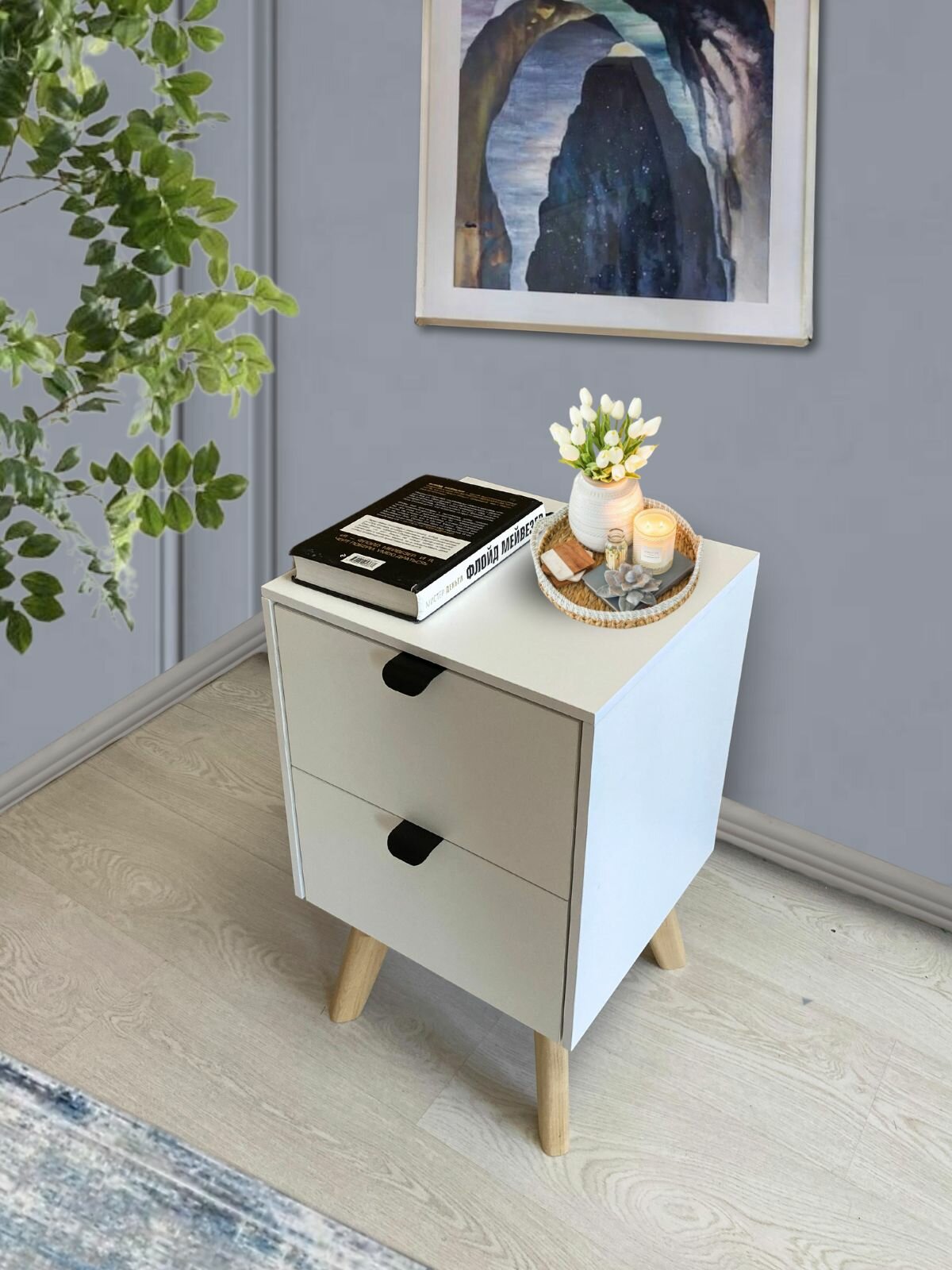 Тумба прикроватная на ножках с ящиками цвет комбинированный светлое дерево и светло серый, 49 см