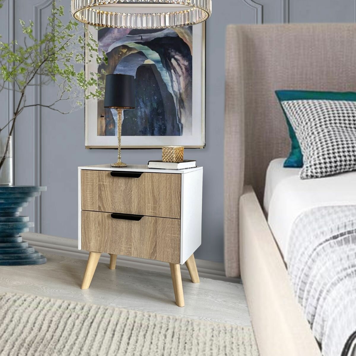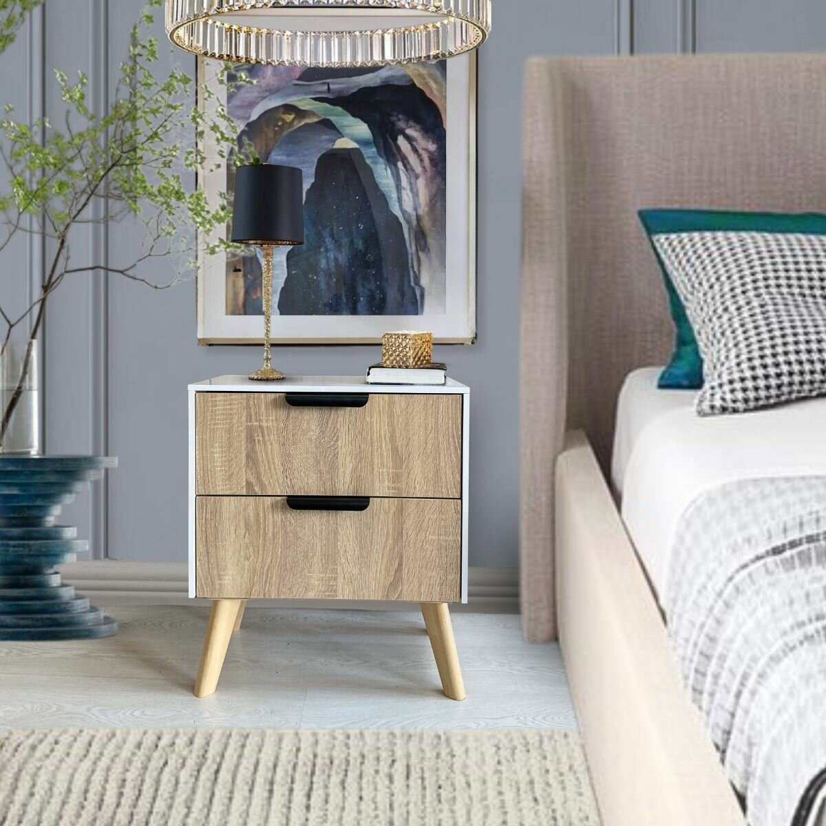 Тумба прикроватная на ножках с ящиками цвет комбинированный светлое дерево и светло серый, 49 см