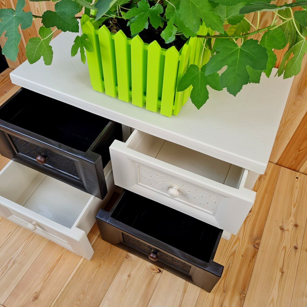 СохранитьКомод широкий, пластиковый, "УЮТ", усиленный, 2 этажа, 4 ящика. Цвет: Бежевый с бежево-шоколадными плетёными ящиками. Арт: К-002-Б2Б2Ш-В2 интересное: