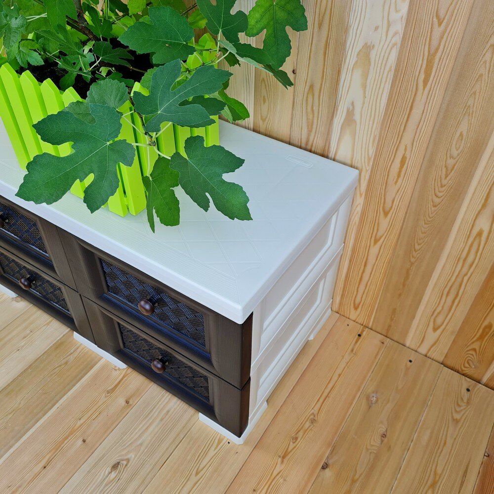 СохранитьКомод широкий, пластиковый, "УЮТ", усиленный, 2 этажа, 4 ящика. Цвет: Бежевый с шоколадными плетёными ящиками. Арт: К-002-Б4Ш интересное: