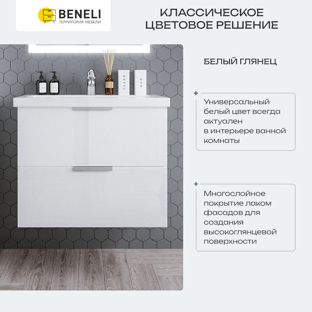 Тумба для ванной комнаты навесная Beneli Белый глянец, 2 ящика, 60 см, 1 шт.