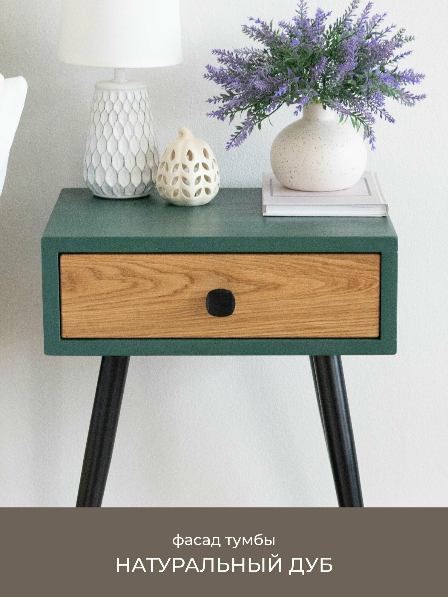 Тумба прикроватная Zolo из натурального дерева - массив дуба и сосна. Высота 50 см. Парящий корпус 30х39 см. Цвет: орех/зеленый.