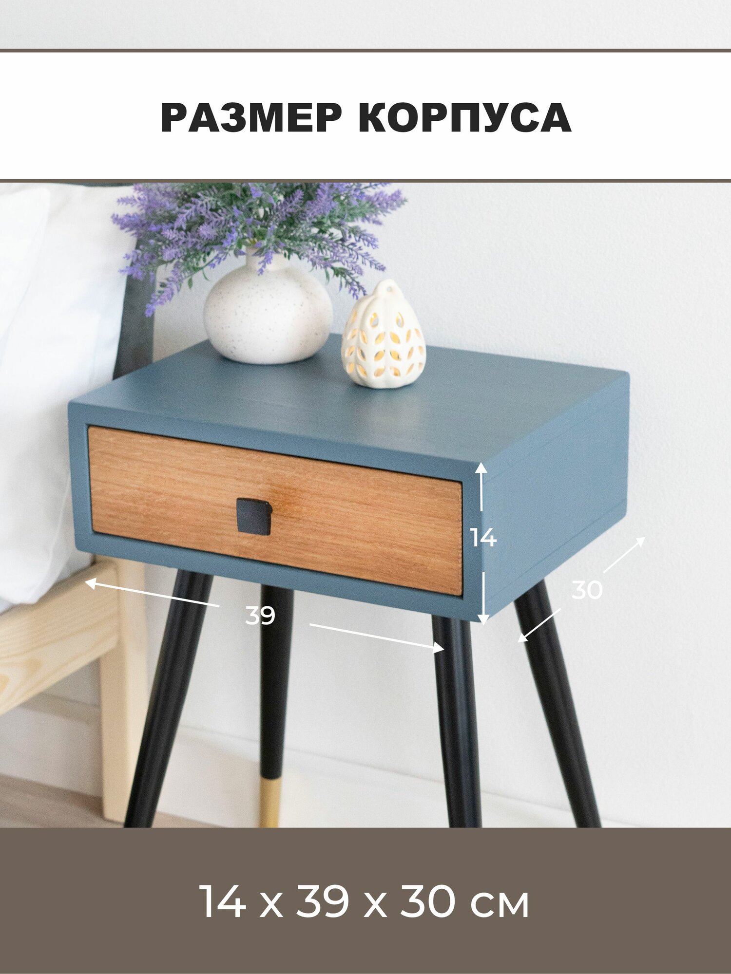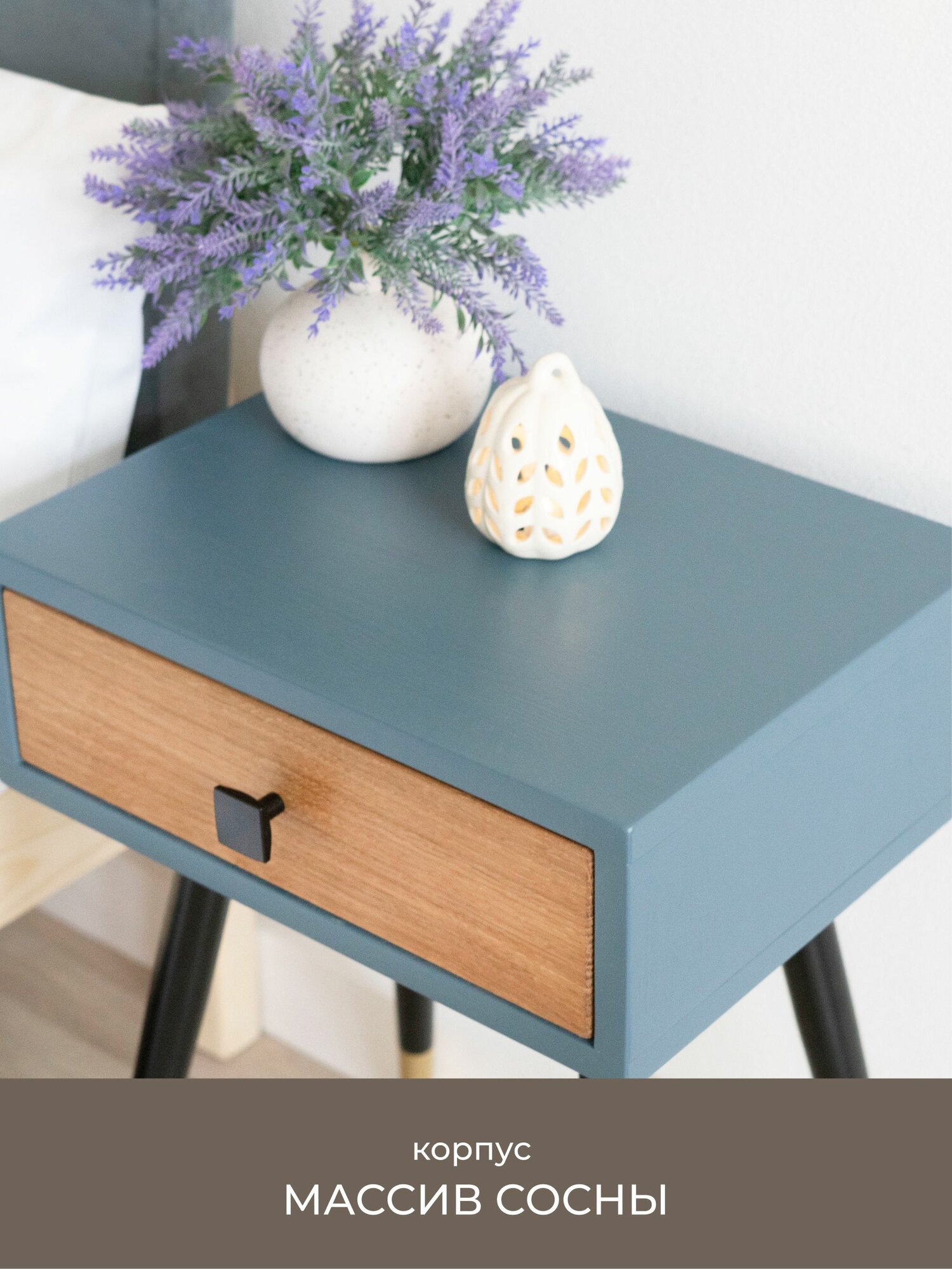 Тумба прикроватная Zolo из натурального дерева - массив дуба и сосны. Высота 60 см. Парящий корпус 30х39 см. Цвет синий.