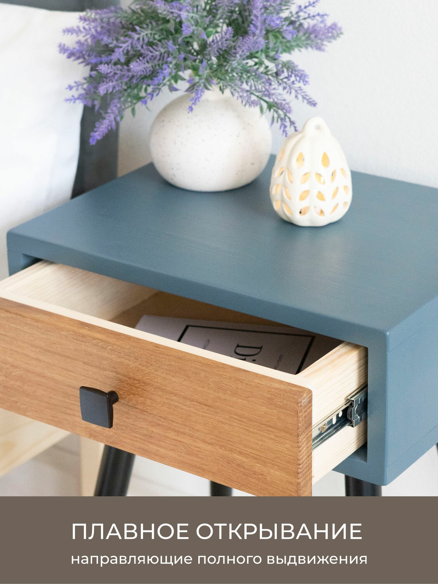 Тумба прикроватная Zolo из натурального дерева - массив дуба и сосны. Высота 50 см. Парящий корпус 30х39 см. Цвет синий.