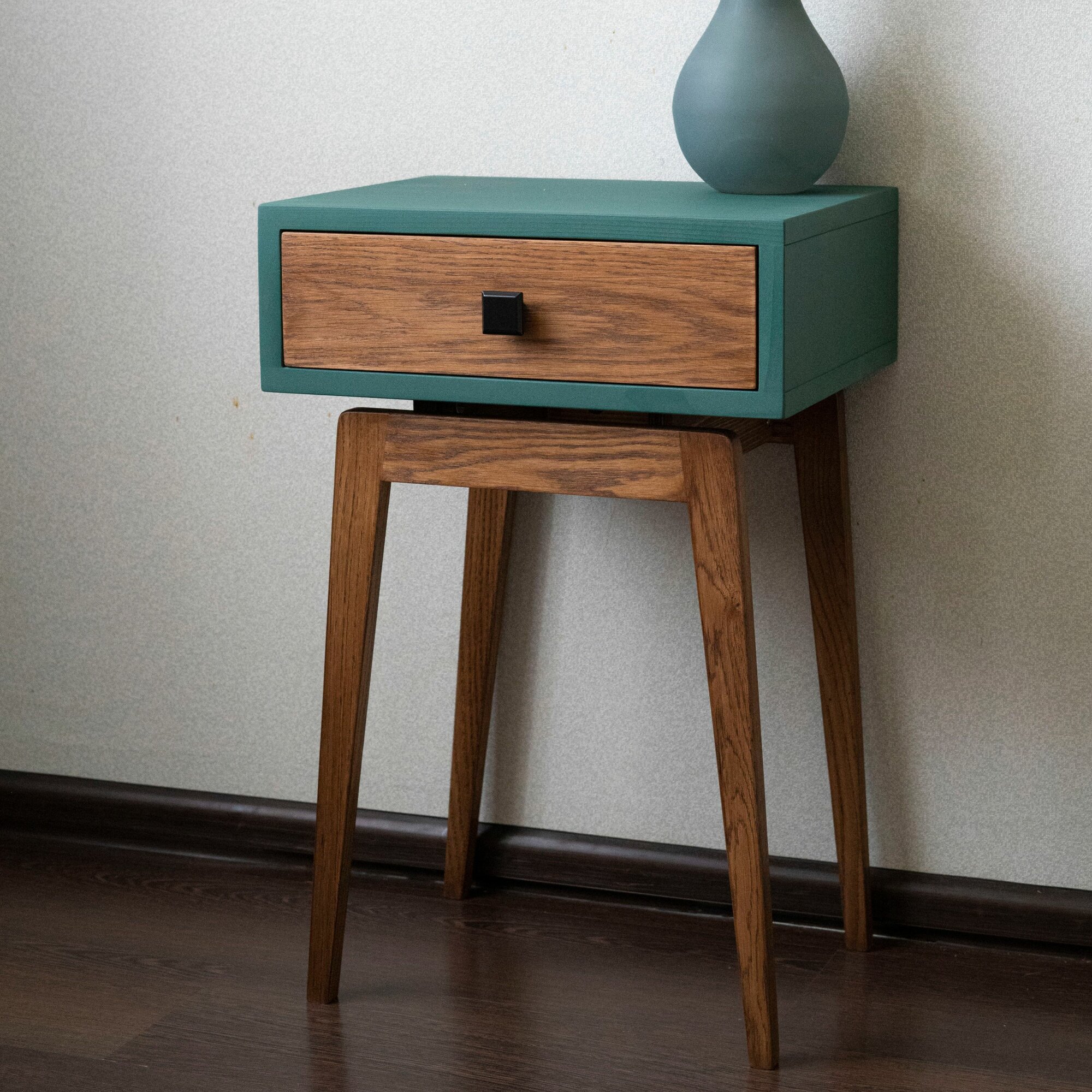 СохранитьТумба прикроватная Zolo из натурального дерева - массив дуба и сосна. Высота 50 см. Парящий корпус 30х39 см. Цвет: орех/зеленый. интересное: