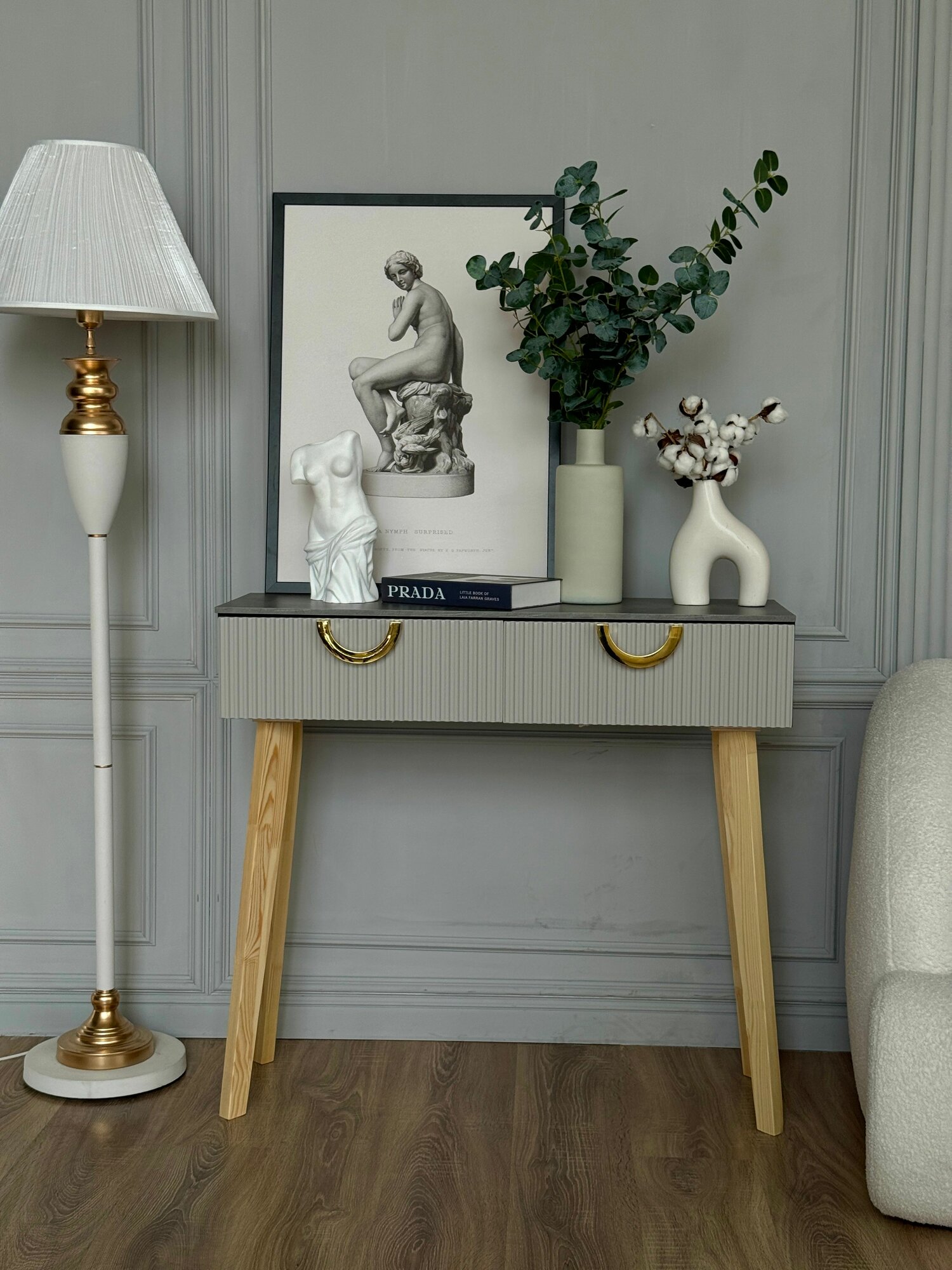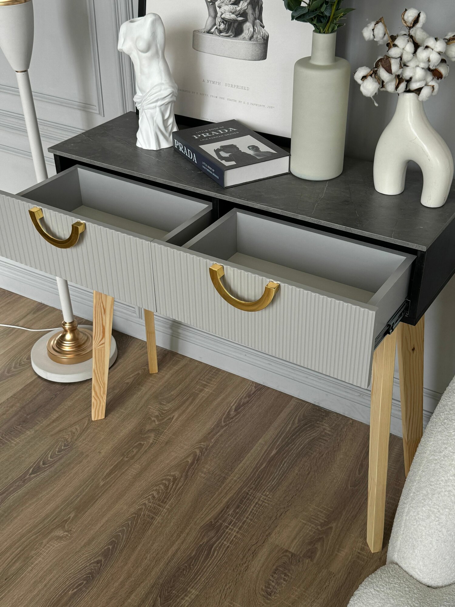 Туалетный столик консоль в комплекте с тумбой прикроватной на ножках интересное: