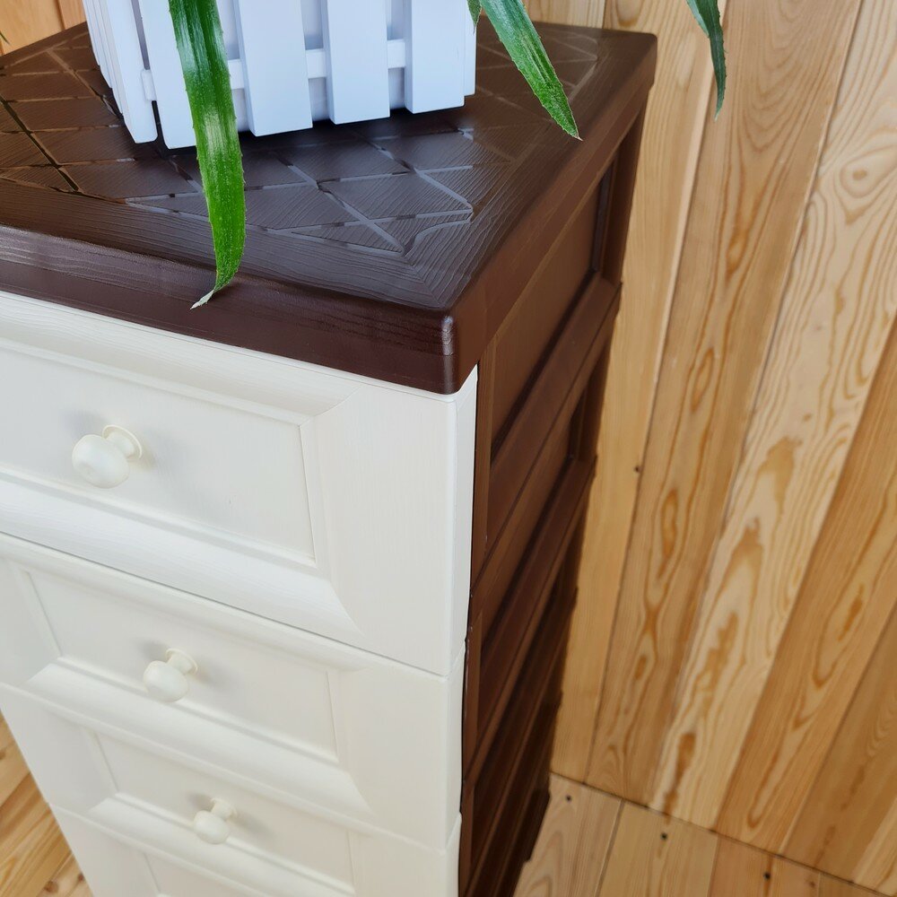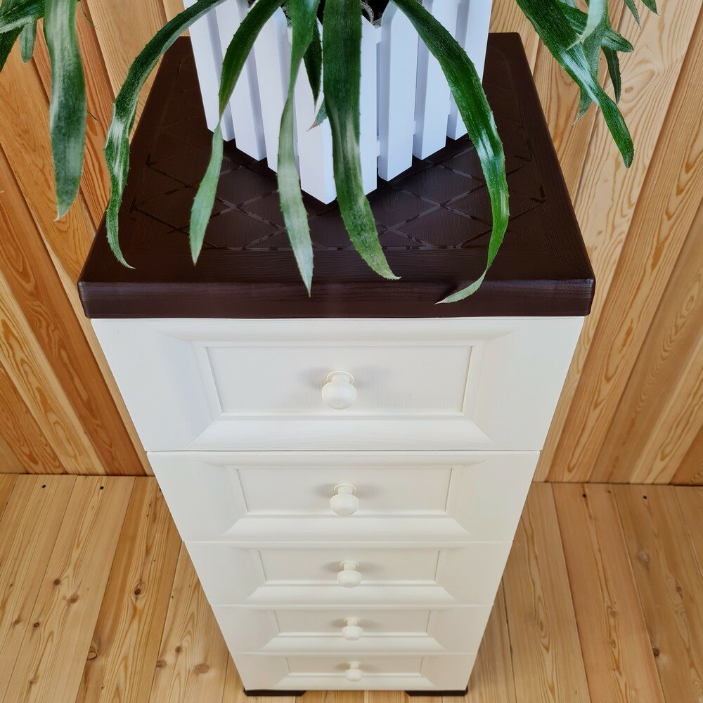 СохранитьКомод пластиковый, "УЮТ", усиленный, 5 этажей, Цвет: Коричневый с бежевыми сплошными ящиками. Арт: К-013-Д5Б интересное: