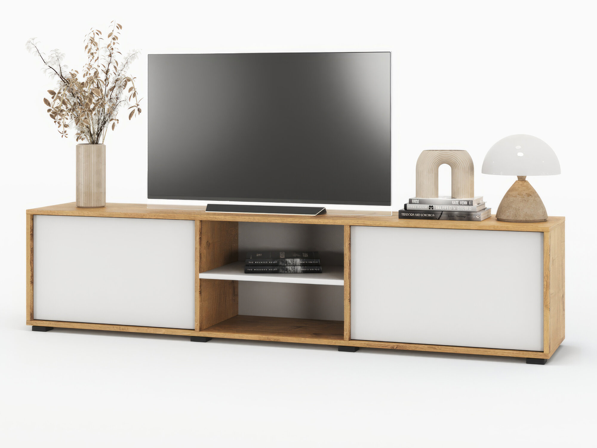 Есэндвич Grand Лаворо 2 Тумба ТВ, 180х43х35 см (Дуб сонома/Белый), с полками, с дверцами, для гостиной
