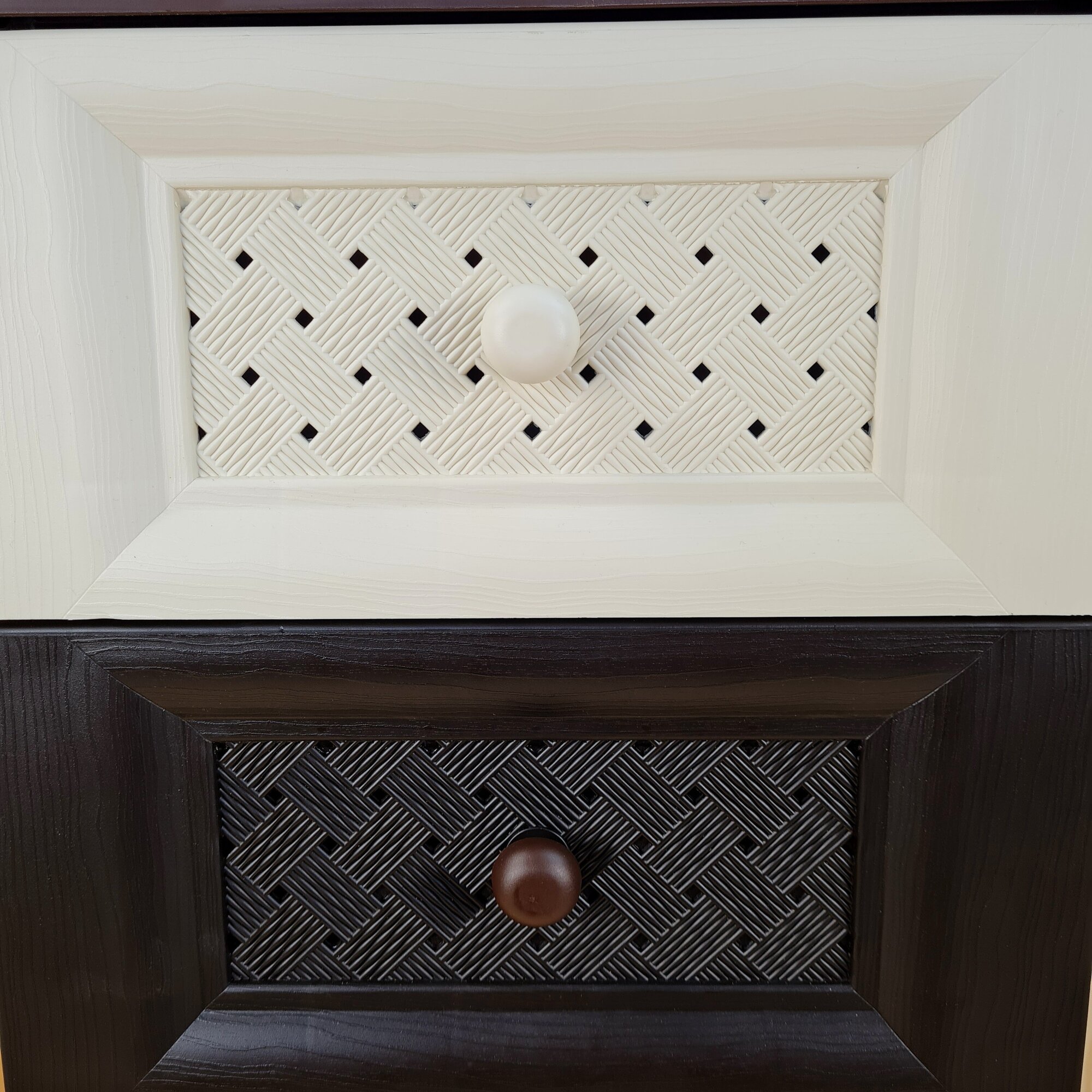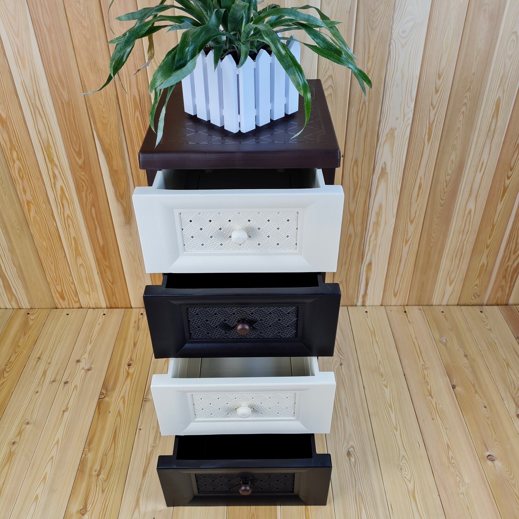 Комод пластиковый ,"УЮТ", усиленный, 4 этажа, Цвет: Коричневый с бежево-коричневыми плетёными ящиками.