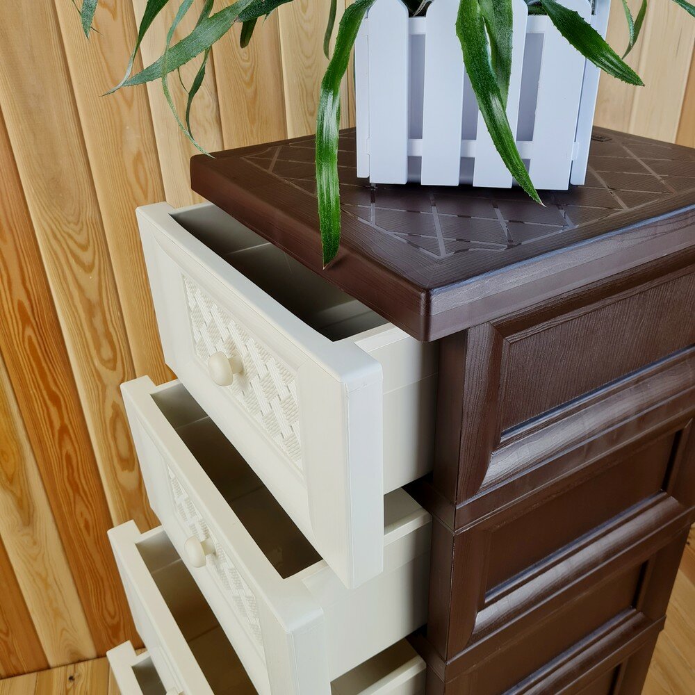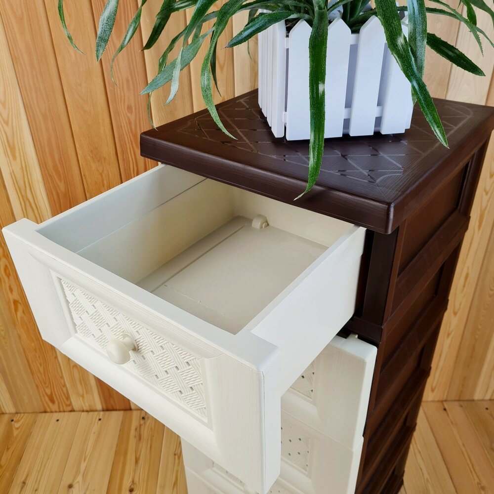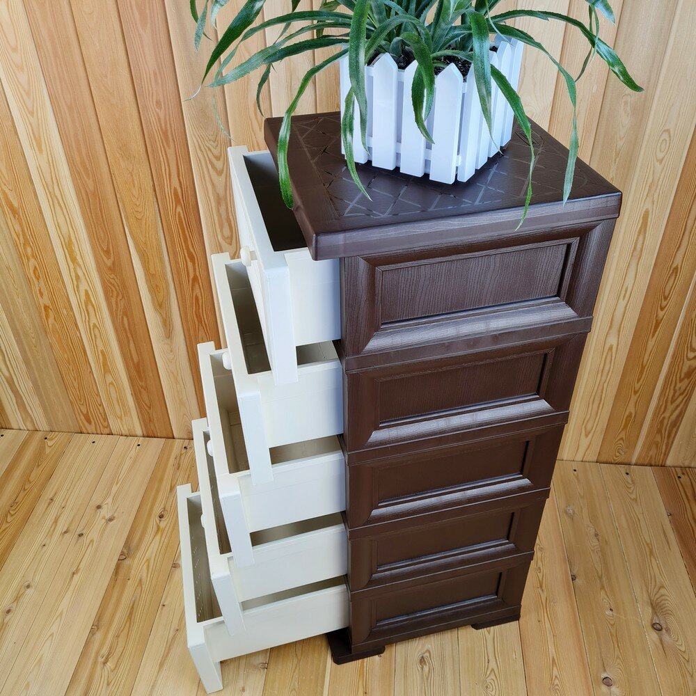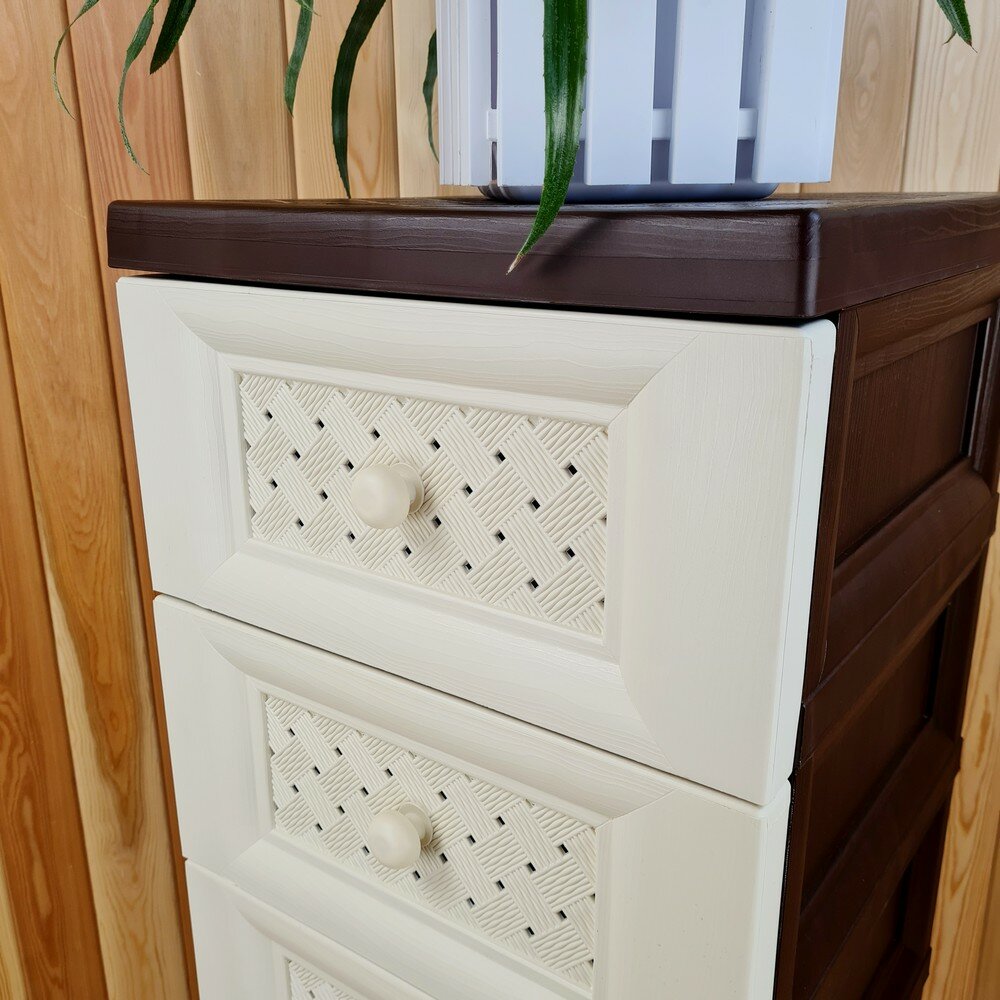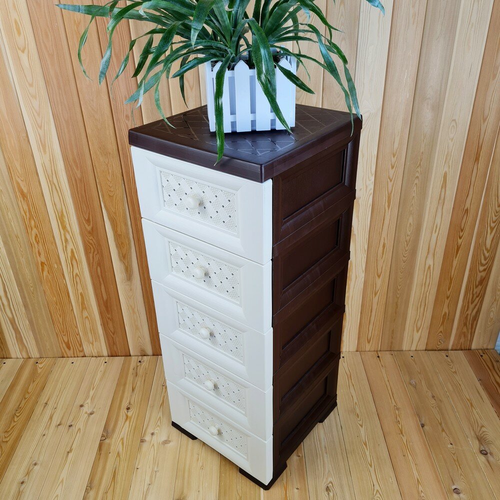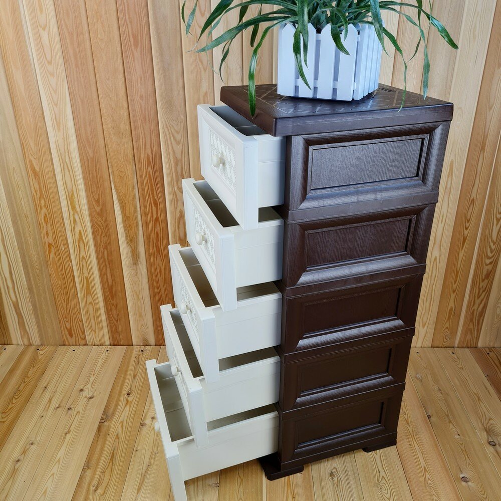 Комод пластиковый, "УЮТ", усиленный, 5 этажей, Цвет: Коричневый с бежевыми плетёными ящиками. Арт: К-003-Д5Б интересное: