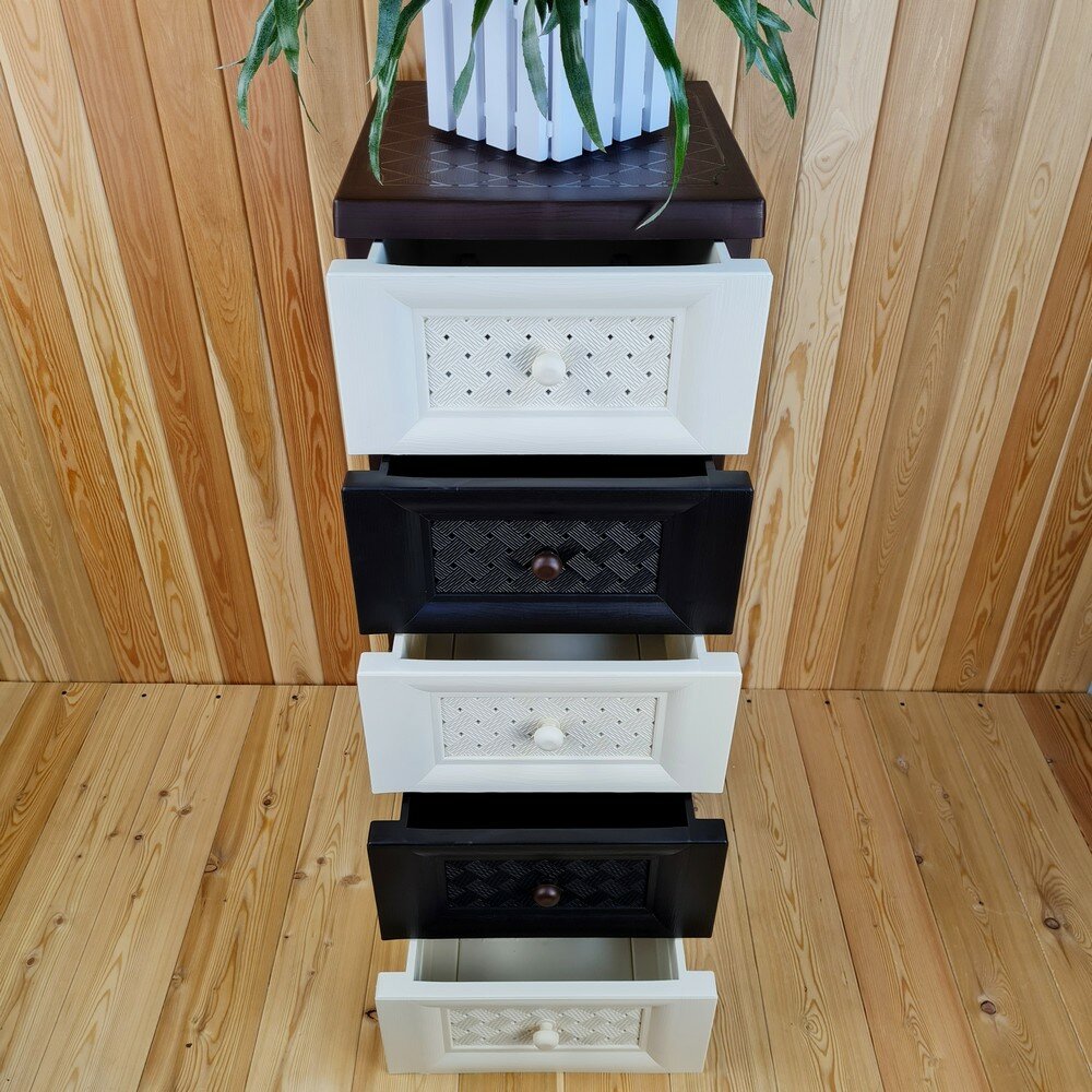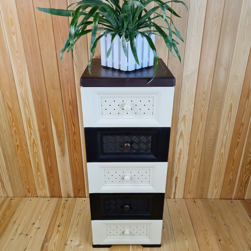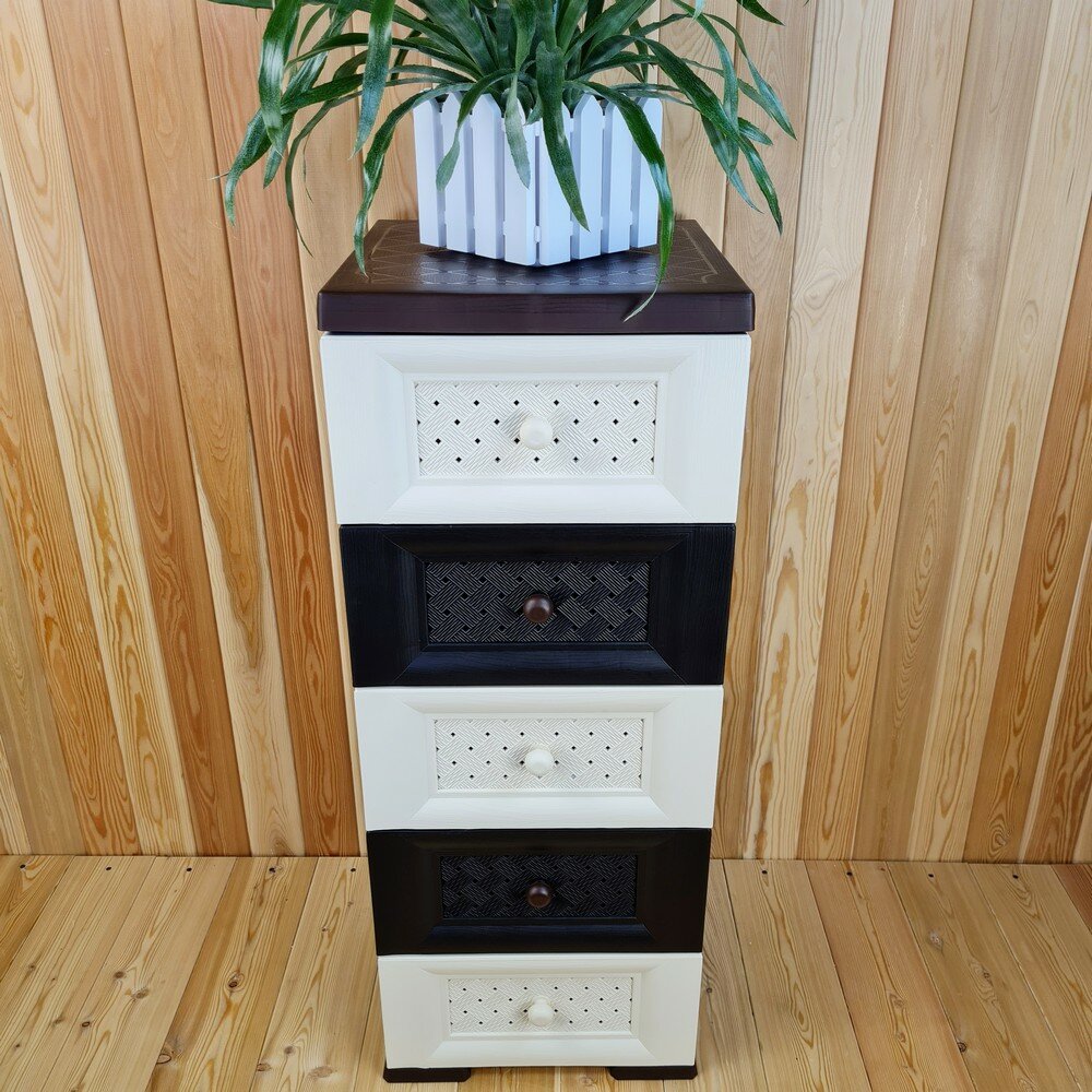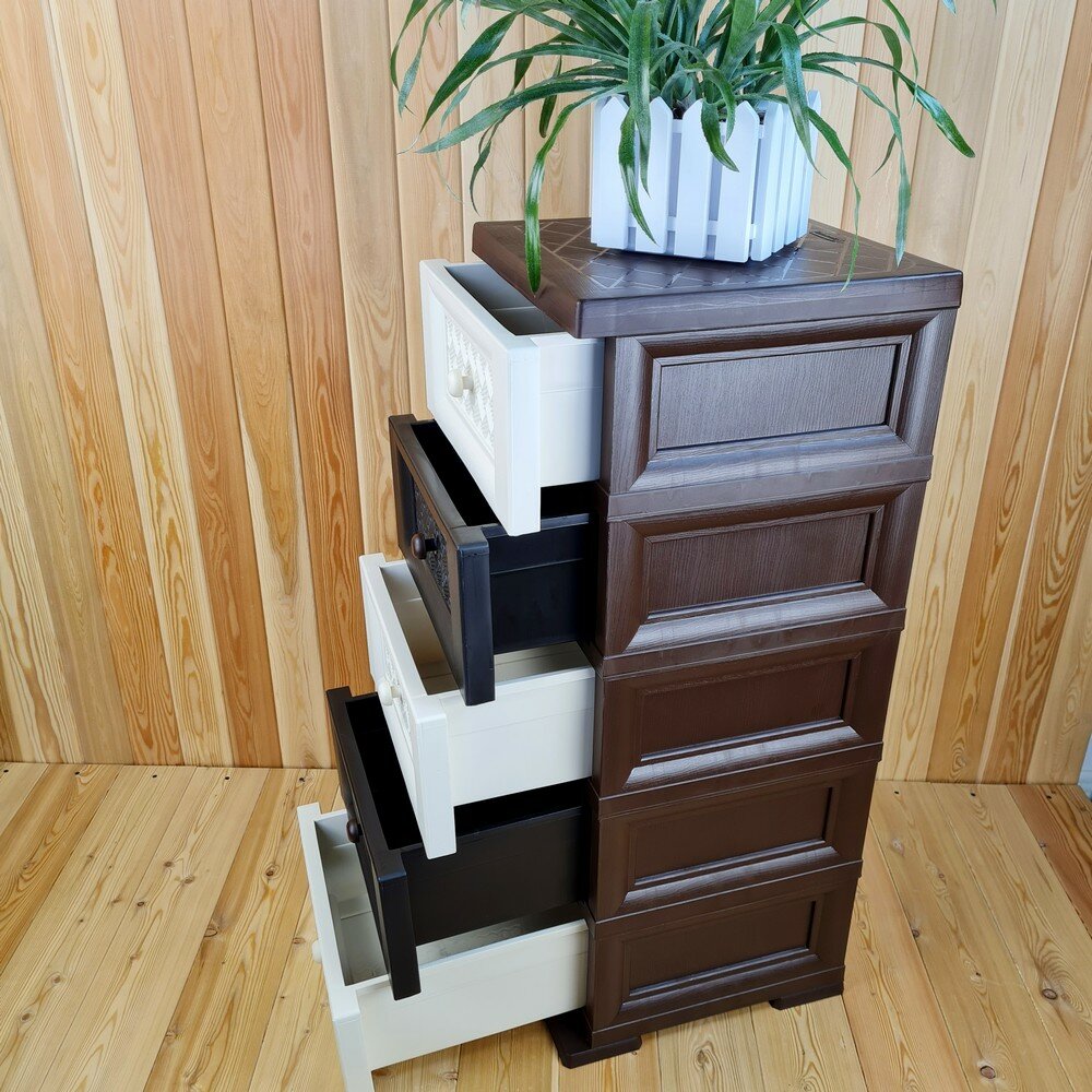 Комод пластиковый, "УЮТ", усиленный, 5 этажей, Цвет: Коричневый с бежево-шоколадными плетёными ящиками. Арт: К-003-Д3Б2Ш интересное: