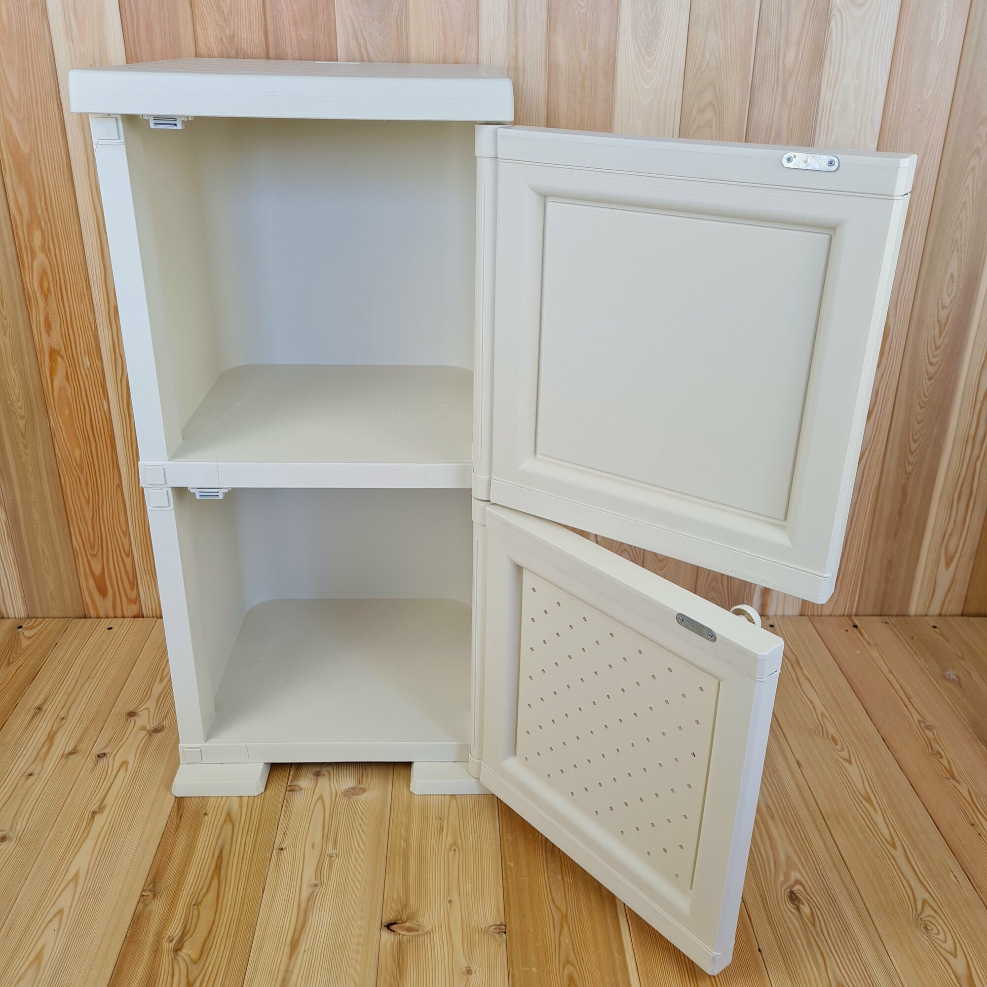 Тумба-шкаф пластиковая "УЮТ", с усиленными рёбрами жёсткости, две дверцы (верхняя сплошная, нижняя сплошная). Цвет: Бежевый с бежевыми дверцами.