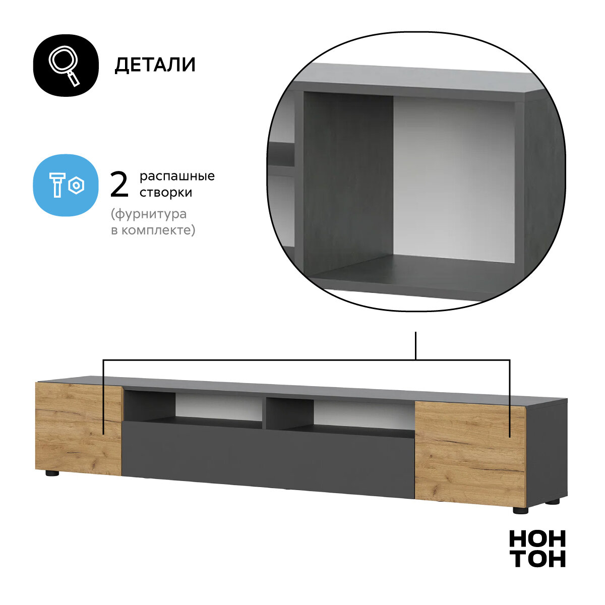 Тумба под телевизор Нонтон Грейс, графит серый / дуб крафт золотой, 200.1x34.6x35.5 см интересное: