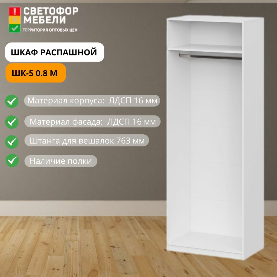 Шкаф распашной Мебельный рай ШК 5 0.8 м с полками и штангой 801х2216х506, Белый