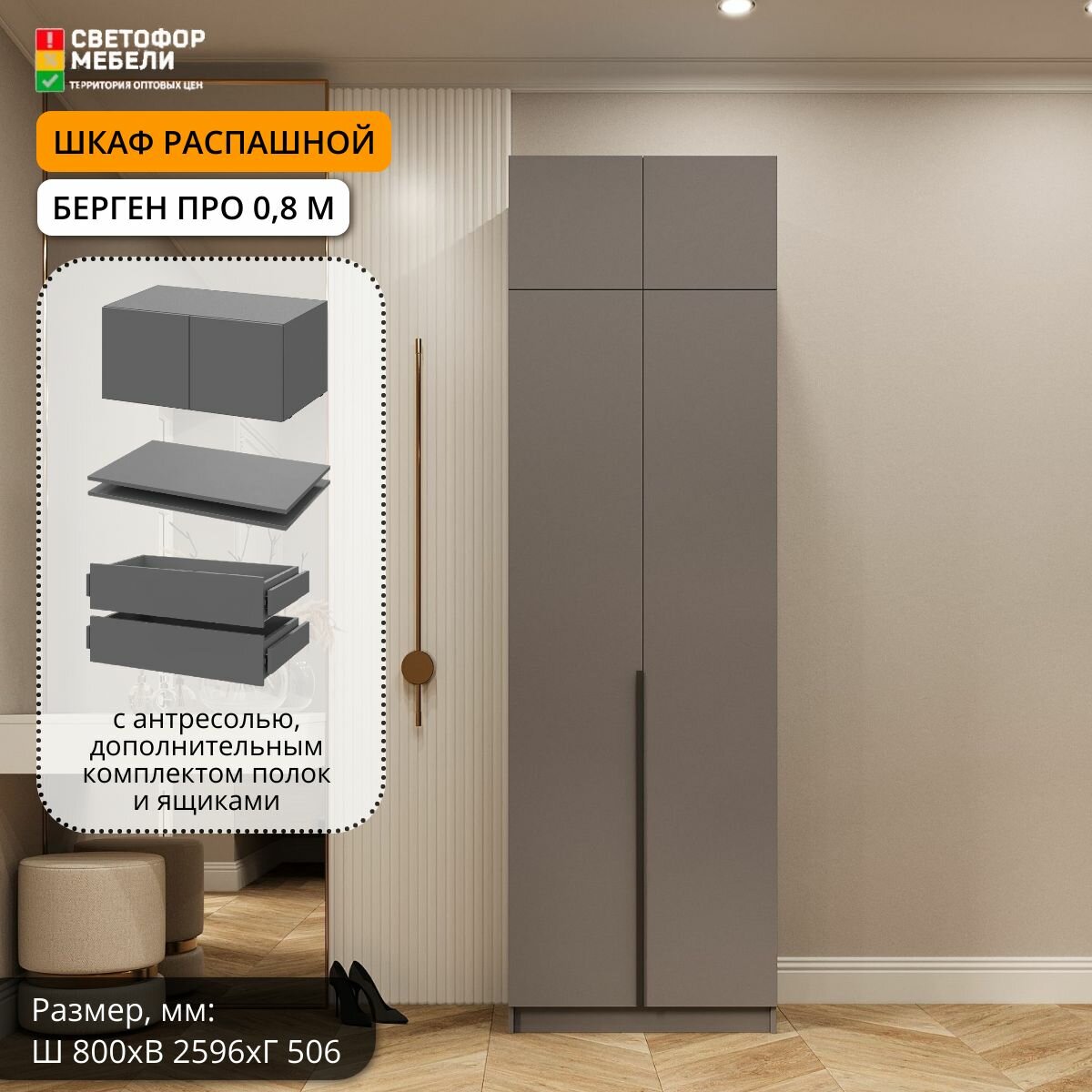 Шкаф распашной Мебельный рай Берген Про 0.8 м с антресолью, штангой, полками и ящиками 800х2596х506, Серый графит интересное: