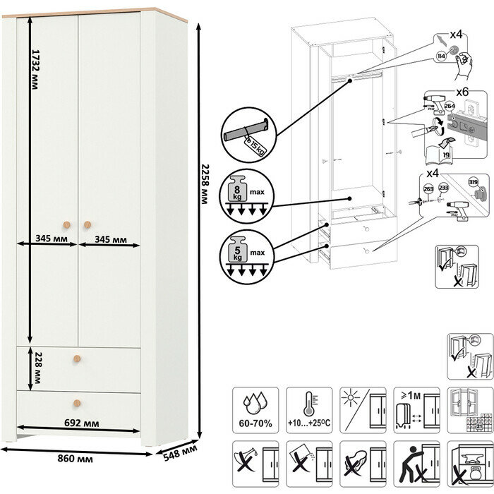 Купить Шкаф распашной с ящиками и штангой Джастин 13.339 цвет белый шагрень/дуб белый эксклюзив, ШхГхВ 86х54,8х225,8 см