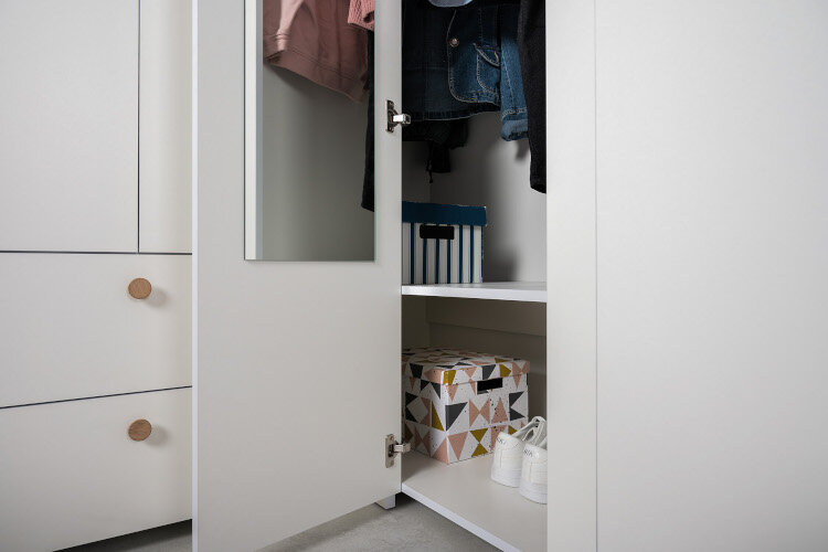 Шкаф Моби Джастин 13.229 цвет белый шагрень/ дуб белый эксклюзив, ШхГхВ 111,4х54,8х225,7 см с зеркалом интересное: