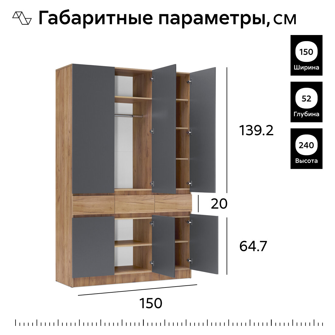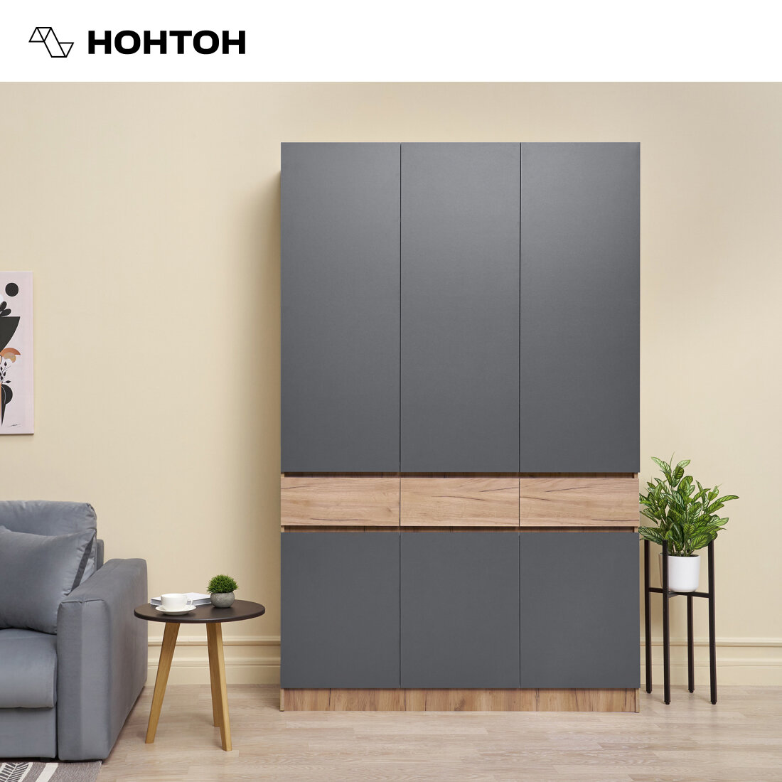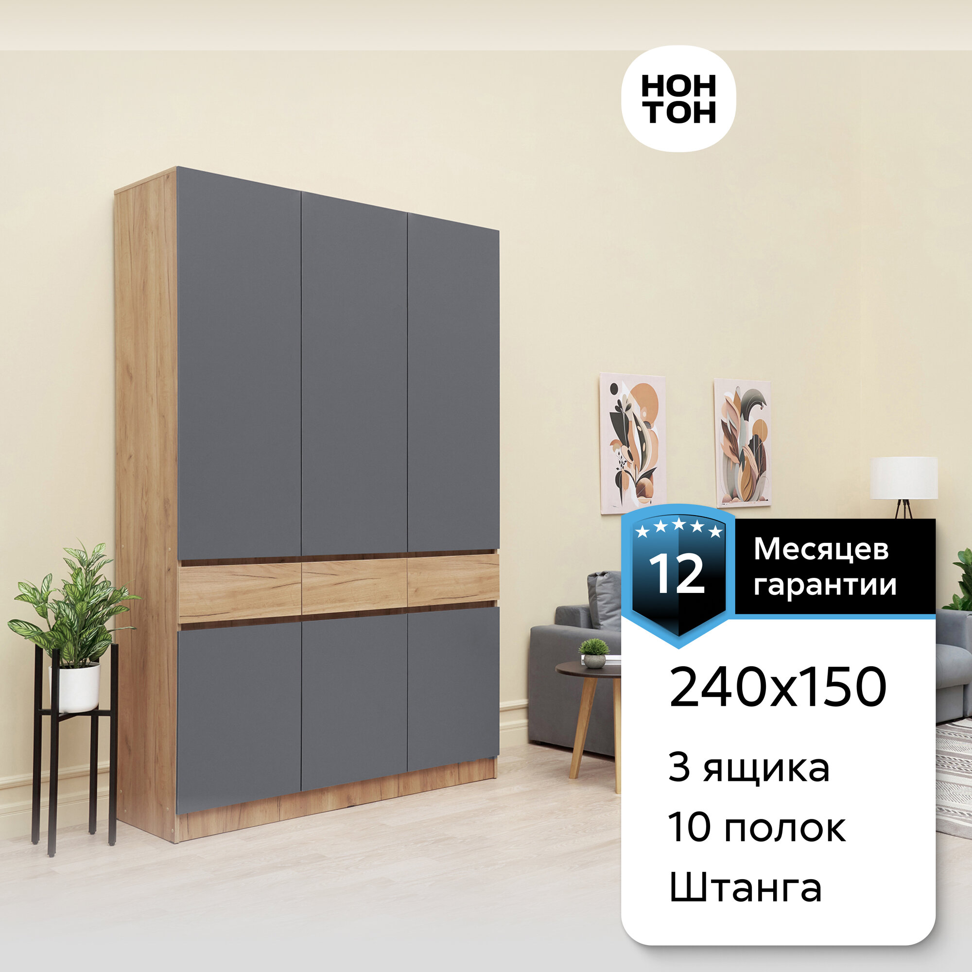 Шкаф для одежды с ящиками Нонтон Роджина, дуб крафт / графит, 150 см интересное: