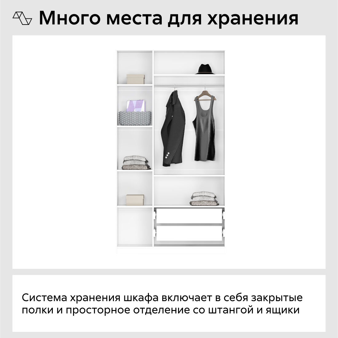 Шкаф для одежды распашной Нонтон Луас, 120 см, 7 полок, 1 штанга, 2 ящика, белый глянец интересное: