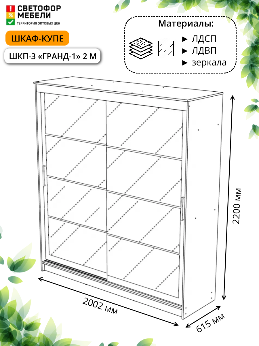 СохранитьШкаф-купе Мебельный рай ШКП 3 Гранд 1 с 2-мя зеркалами 2002х2200х615, Дуб вотан интересное: