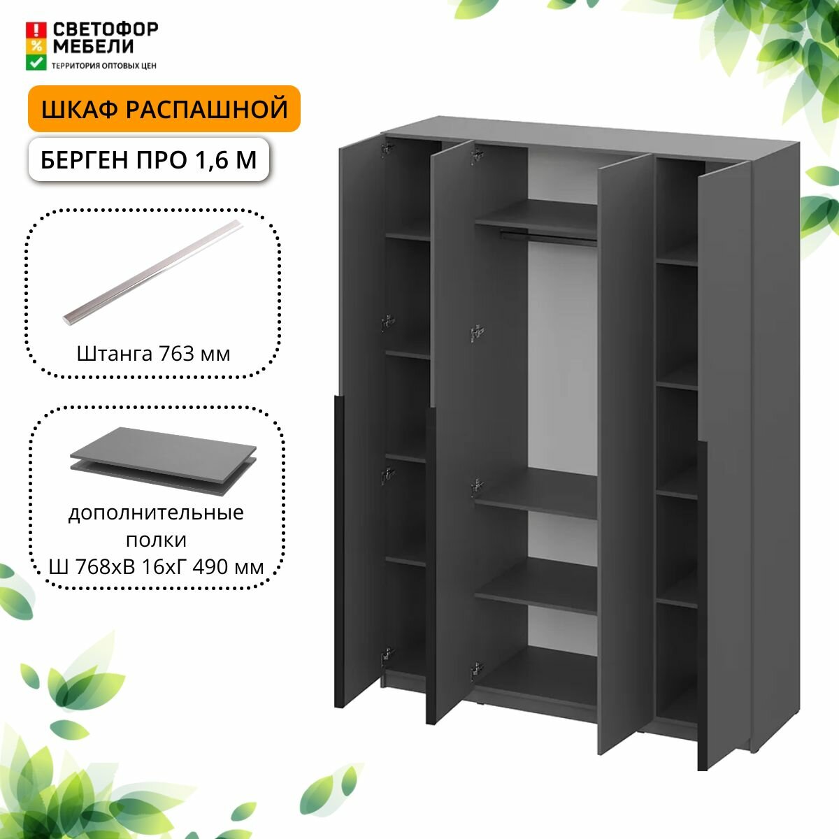Шкаф распашной Мебельный рай Берген Про 1.6 м с антресолью, штангой и полками 1600х2596х506, Серый графит интересное: