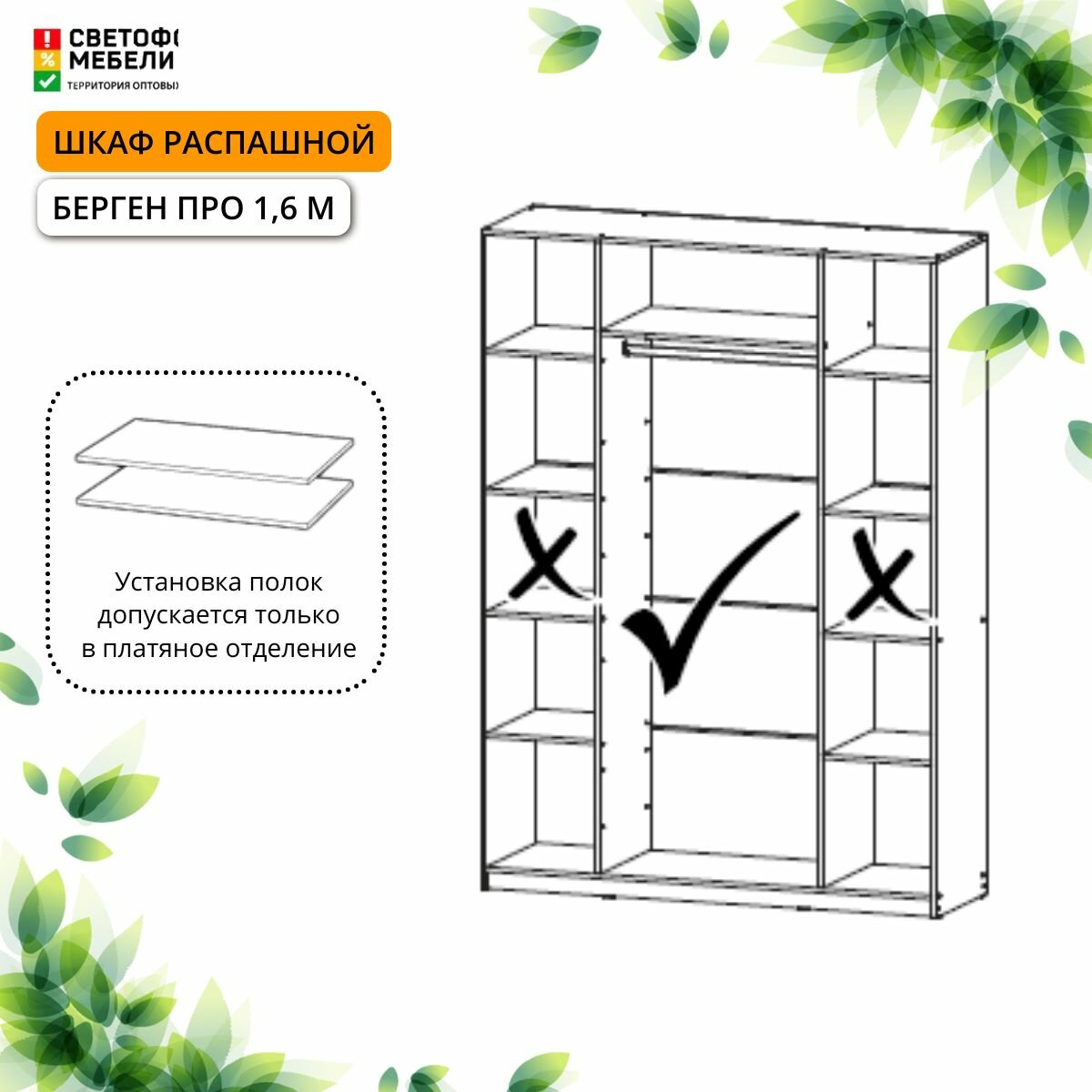Шкаф распашной Мебельный рай Берген Про 1.6 м с антресолью, штангой и полками 1600х2596х506, Белое дерево