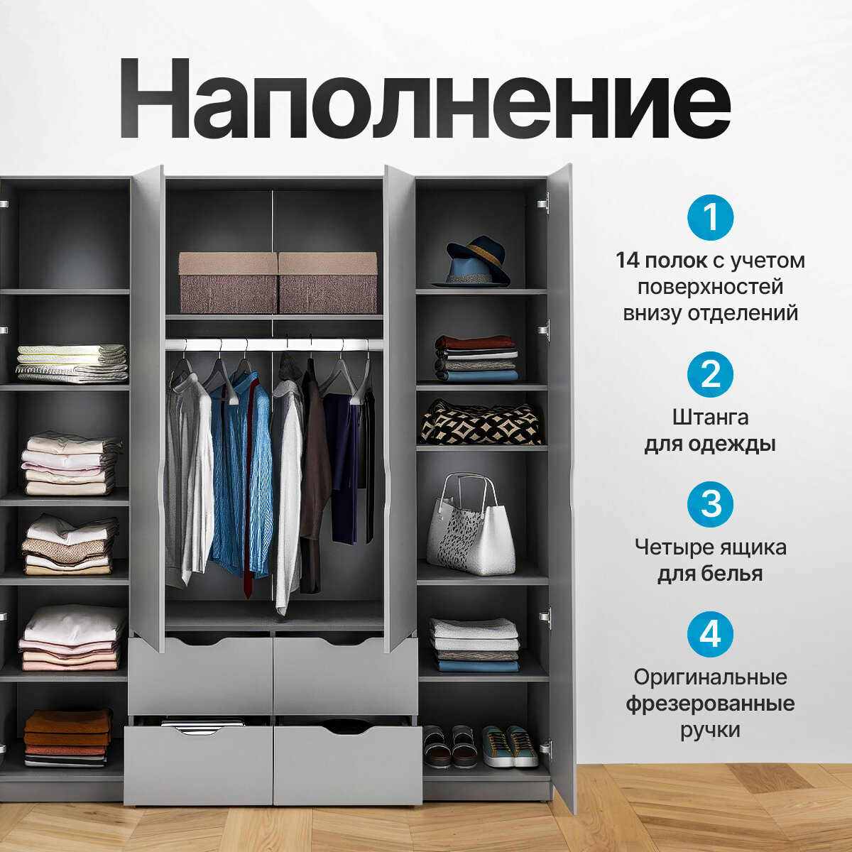 Шкаф четырехстворчатый с ящиками и штангой Есэндвич Grand 3 Лаворо 180х55х200 см (Вулканический серый)