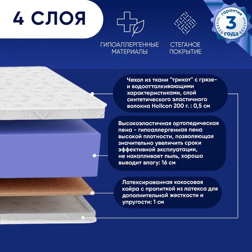 Матрас Vitaflex Medicine 19V Sk 95х190, ортопедический, беспружинный, ППУ, с кокосом, разная жесткость, в скрутке