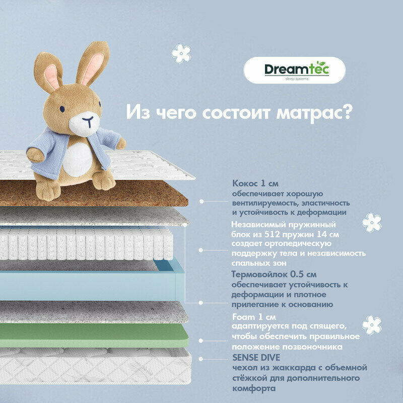 Матрас Dreamtec Spring Cordis 60х120, ортопедический, детский, независимые пружины, разная жёсткость сторон