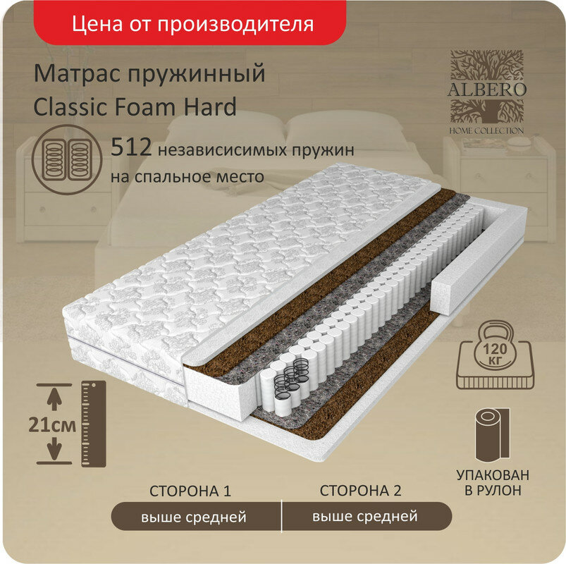 Анатомический матрас Albero Foam Hard, Независимые пружины, 120х195 см