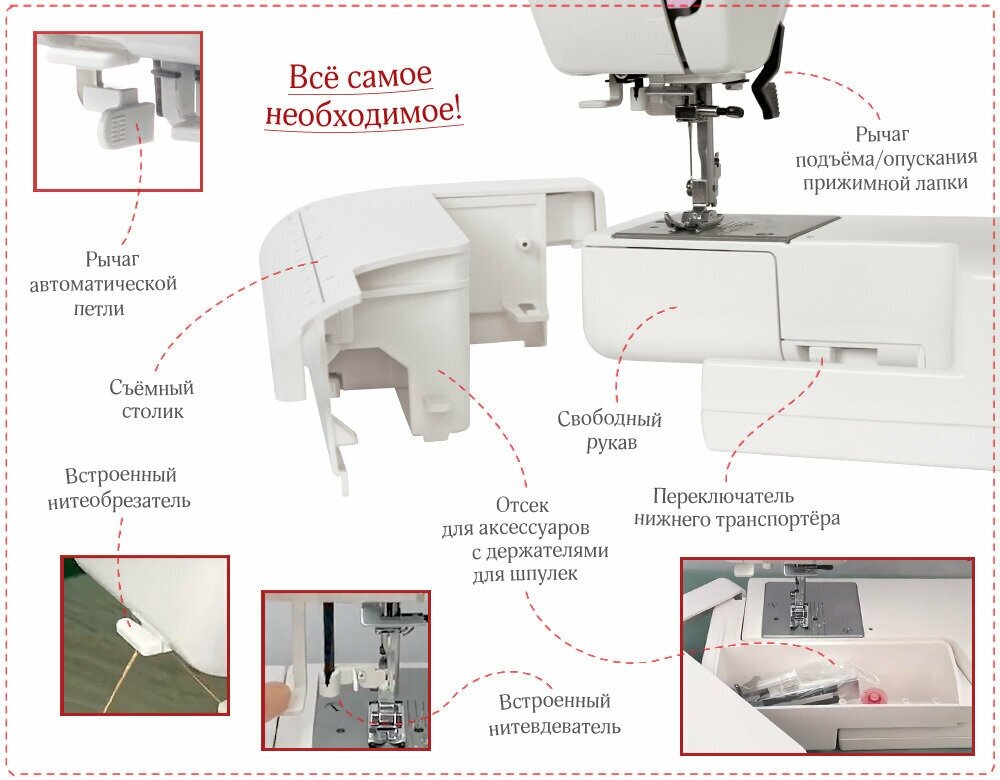 | Строчки | обметочная, потайная, эластичная, эластичная потайная, «зигзаг» |