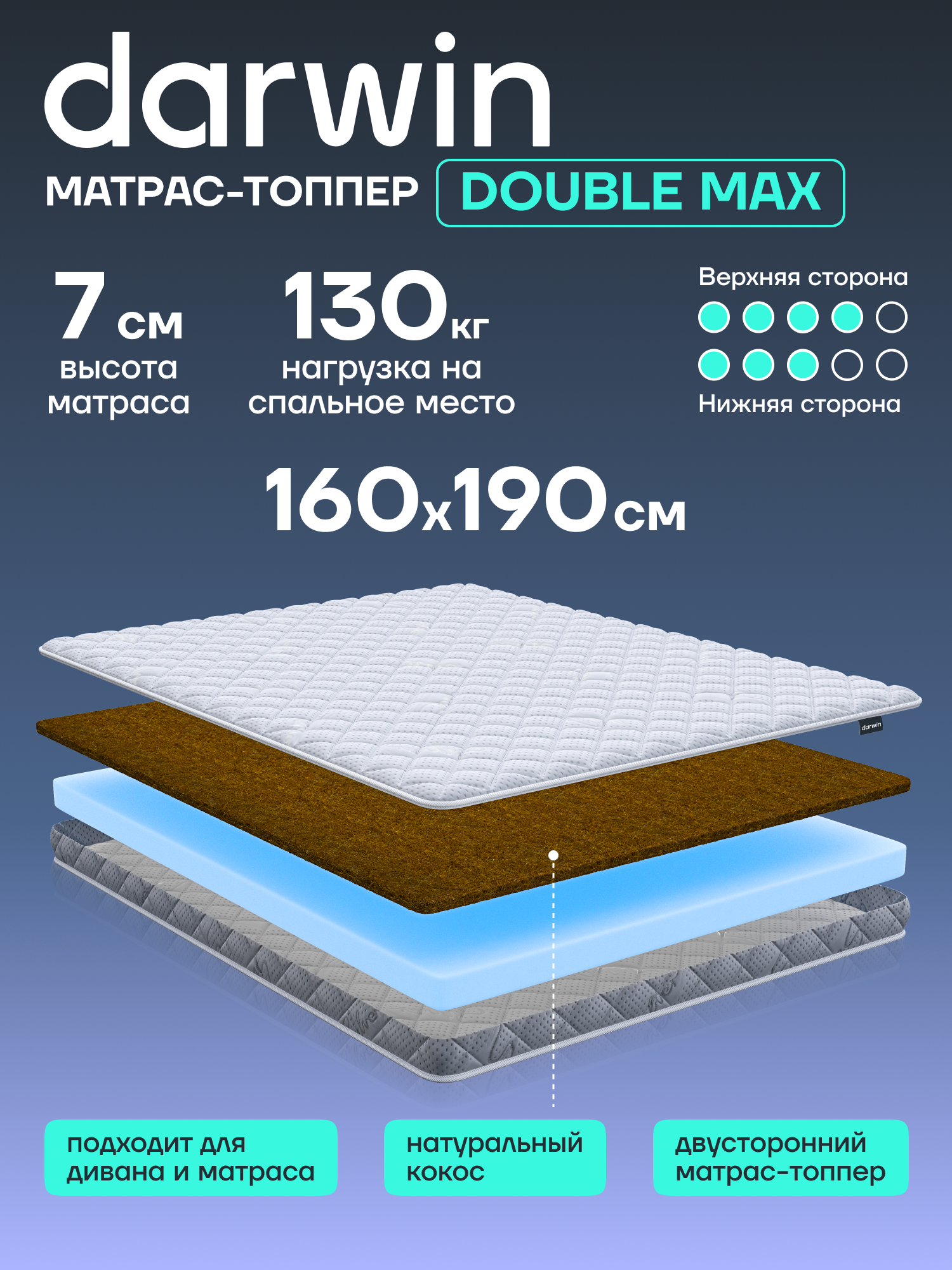 СохранитьМатрас-топпер Darwin Double Max 160х190 см, с кокосовой койрой, двухсторонний с разной жесткостью сторон, высота 7 см интересное: