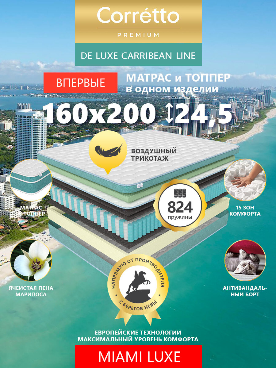 Матрас на кровать ортопедический пружинный Premium Corretto Miami Luxe 195X160