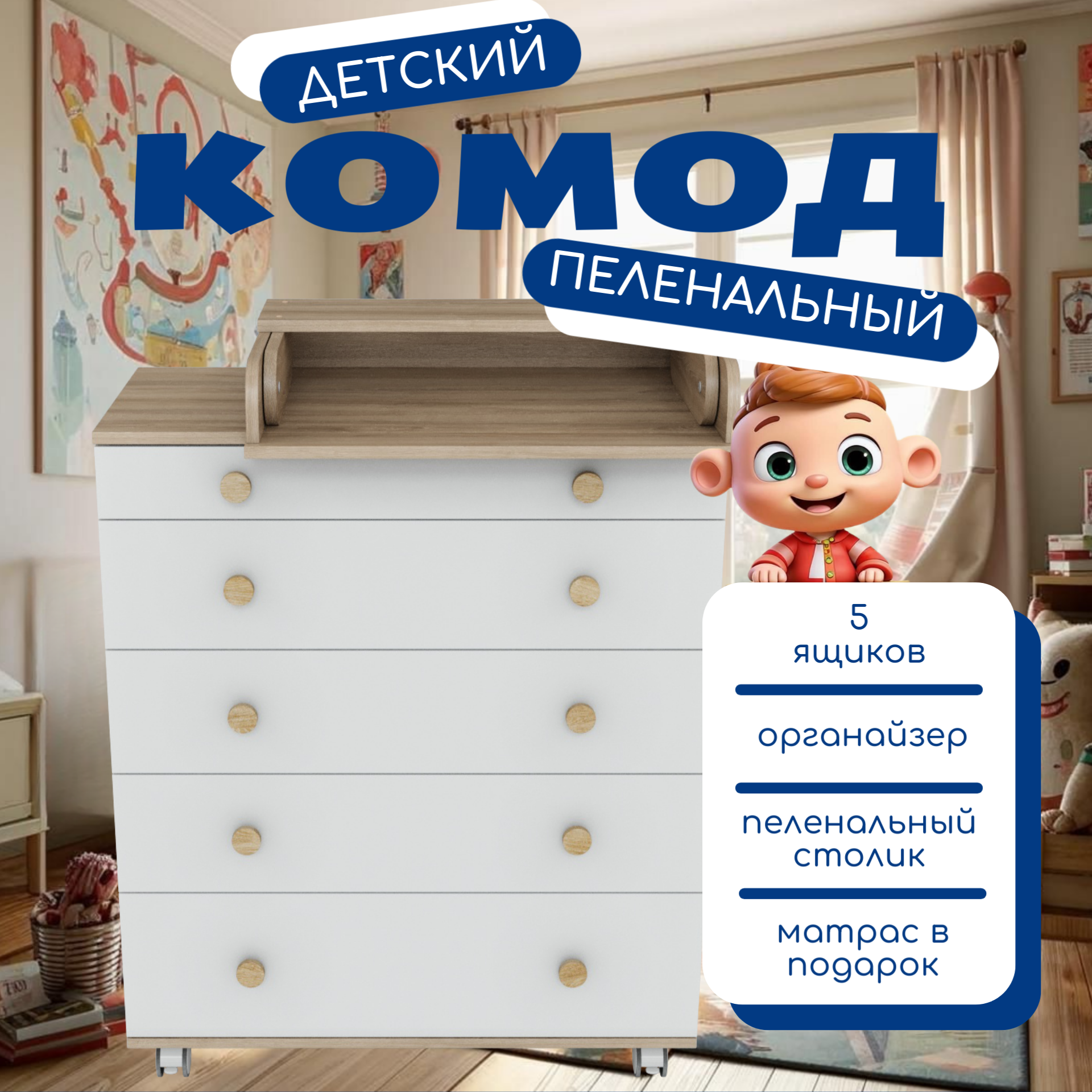 Комод детский с органайзером и матрасиком, 5 ящиков, ЛДСП, дуб белый интересное: