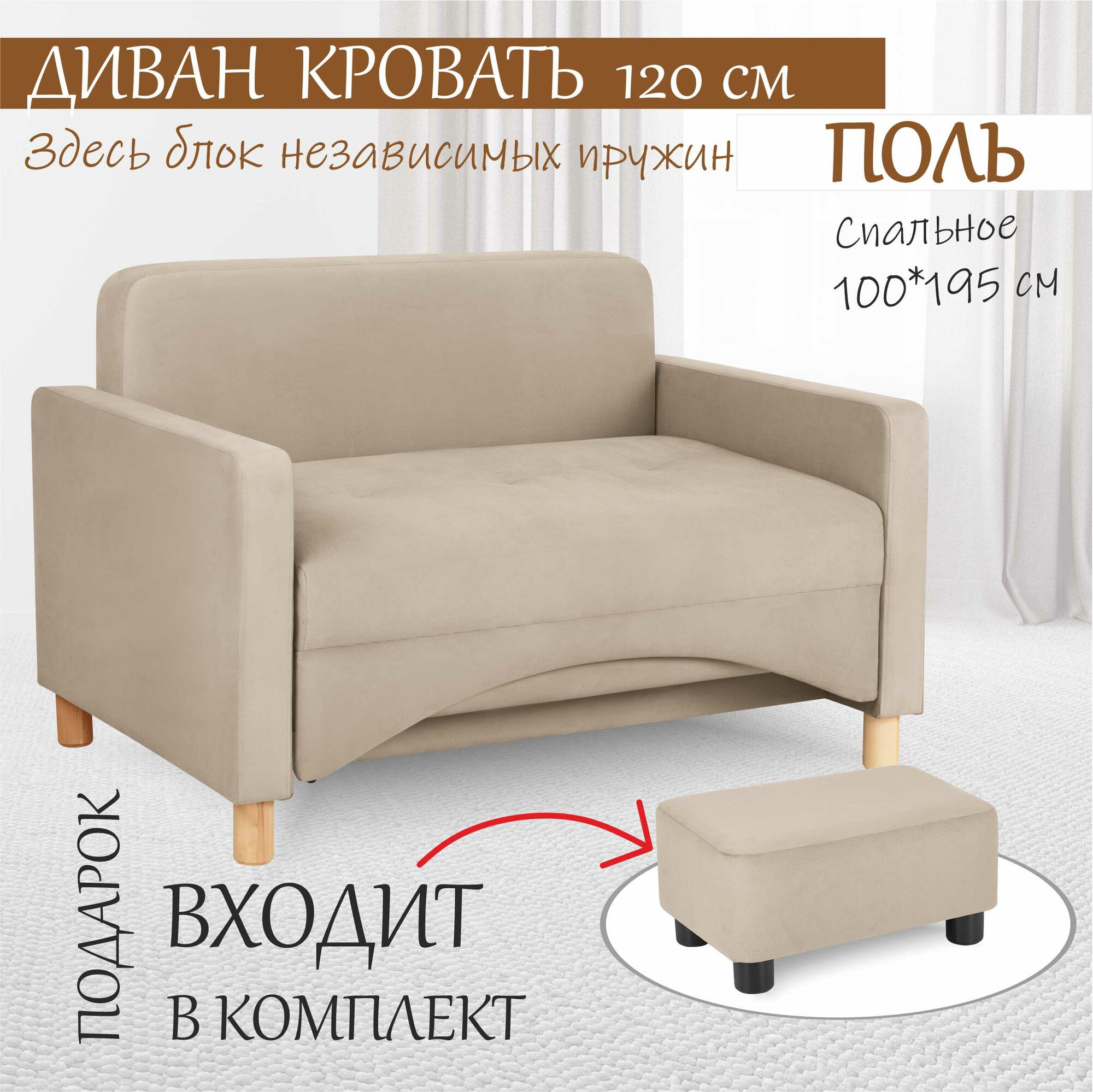 Купить Диван-кровать Поль на блоке независимых пружин, прямой, 122*80*81 см, спальное место 100*194 см, велюр бежевый 07
