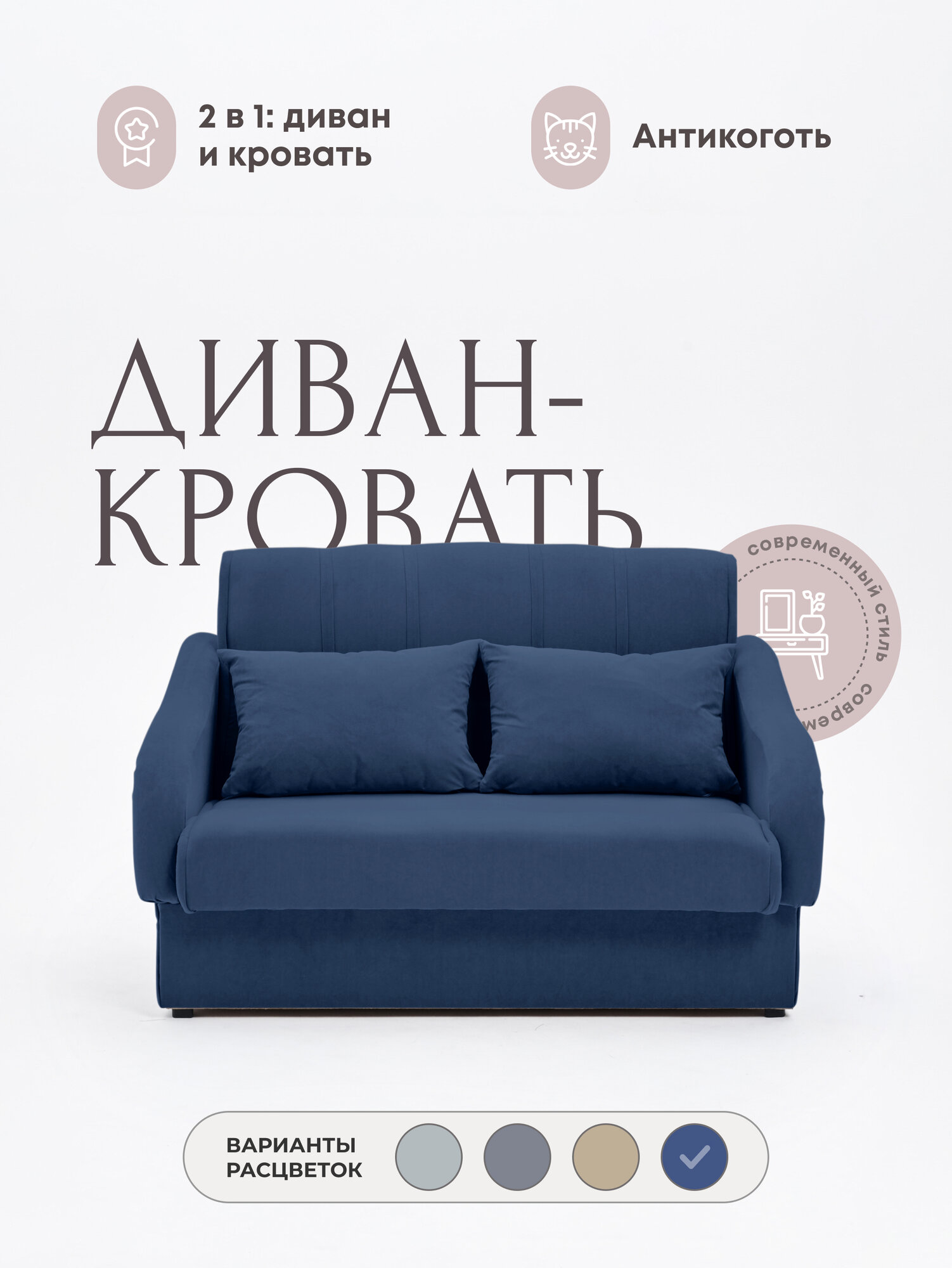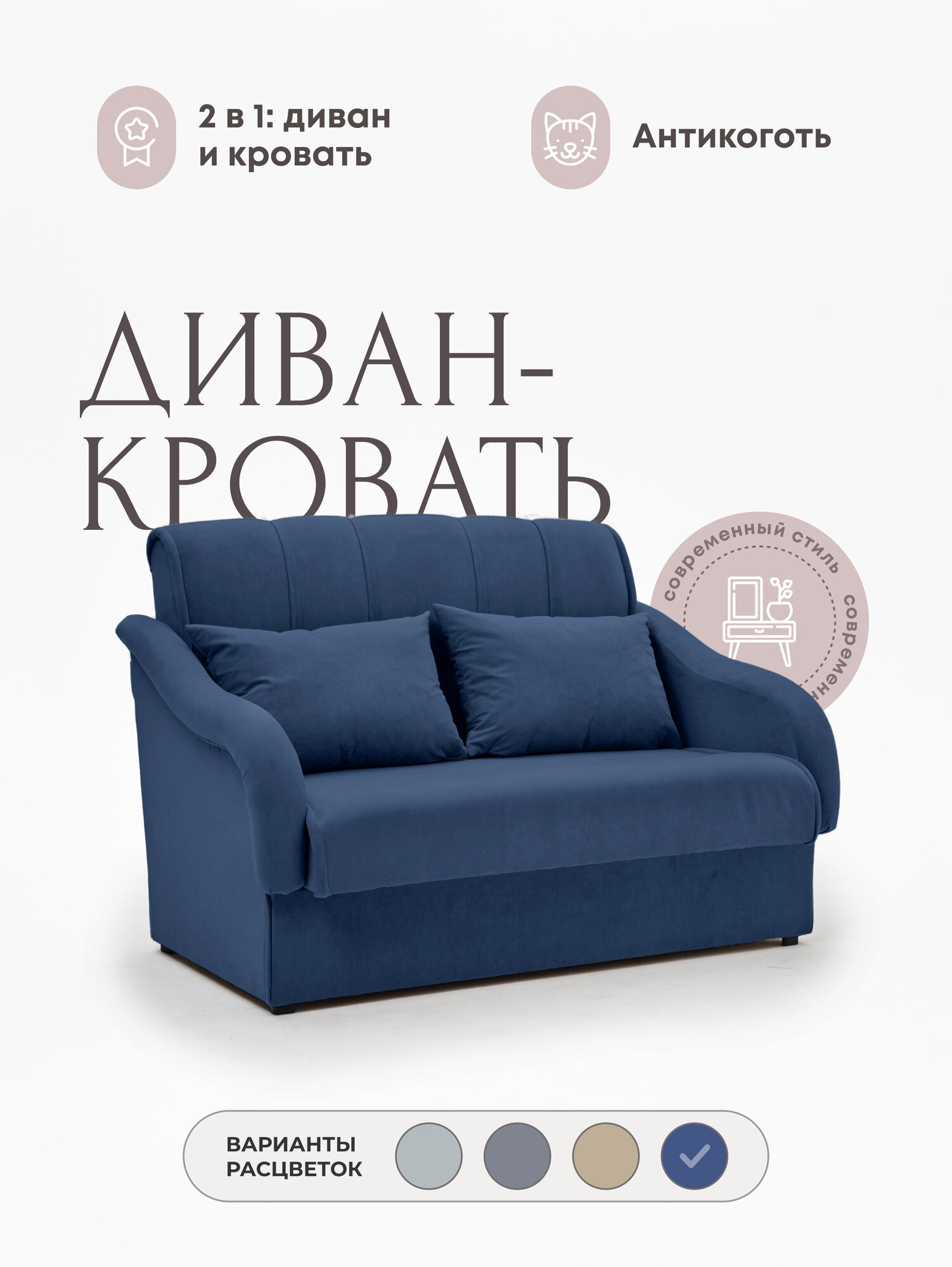 Диван-кровать раскладной двухспальный Тедди беспружинный, антивандальный велюр, размер 140*90*92, цвет синий интересное: