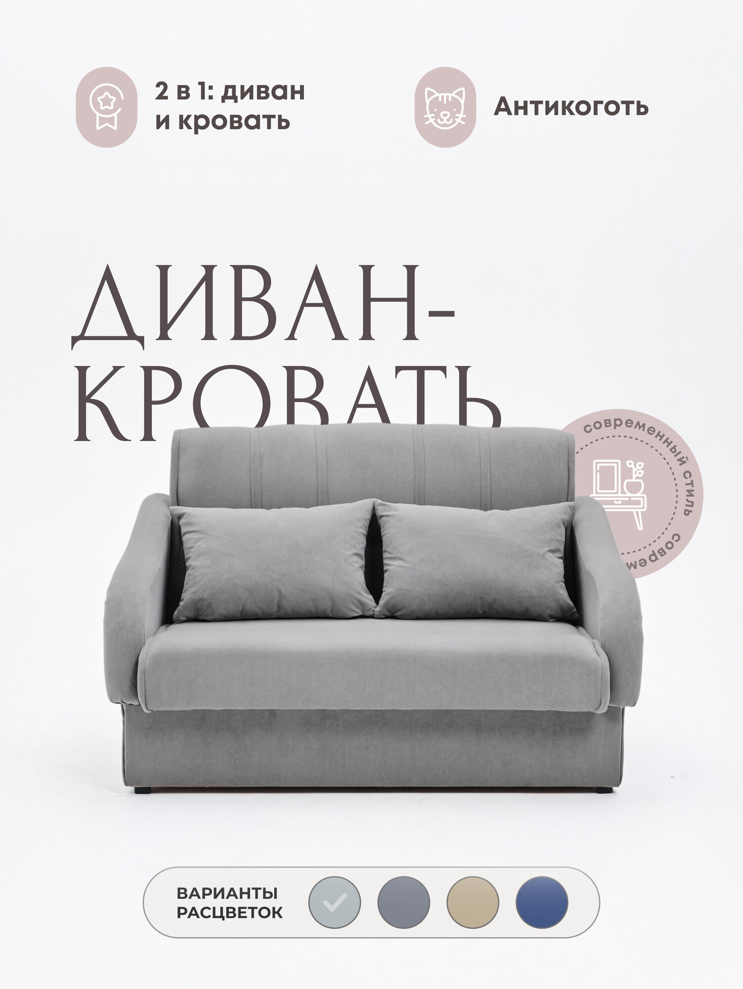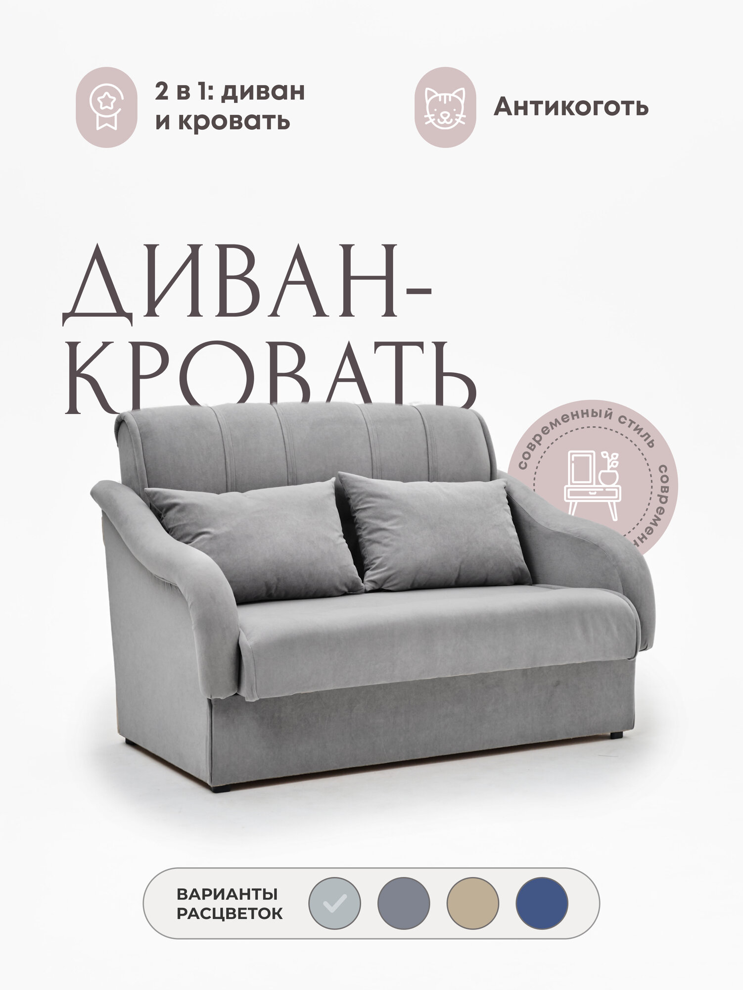 Диван-кровать раскладной двухспальный Тедди беспружинный, антивандальный велюр, размер 140*90*92, цвет серый интересное: