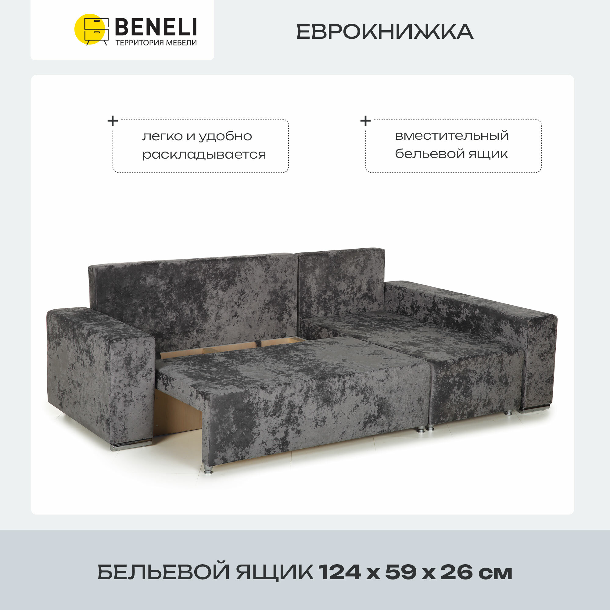 Угловой диван-кровать Beneli техас с подушками, с ящиком для хранения, темно-серый, велюр, механизм еврокнижка, 240х134х85см