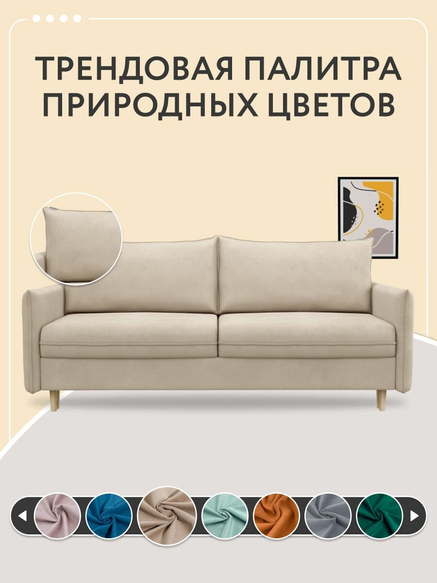 Купить Диван-кровать раскладной прямой на ножках Сканди в гостиную, пантограф, двуспальный, велюр, бежевый, 212х96х90