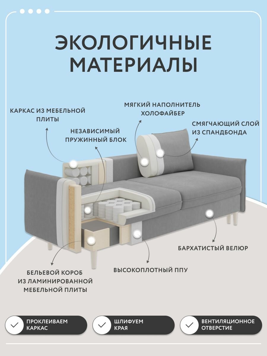 Диван-кровать раскладной прямой на ножках Сканди в гостиную, пантограф, двуспальный, велюр, серый, 212х96х90