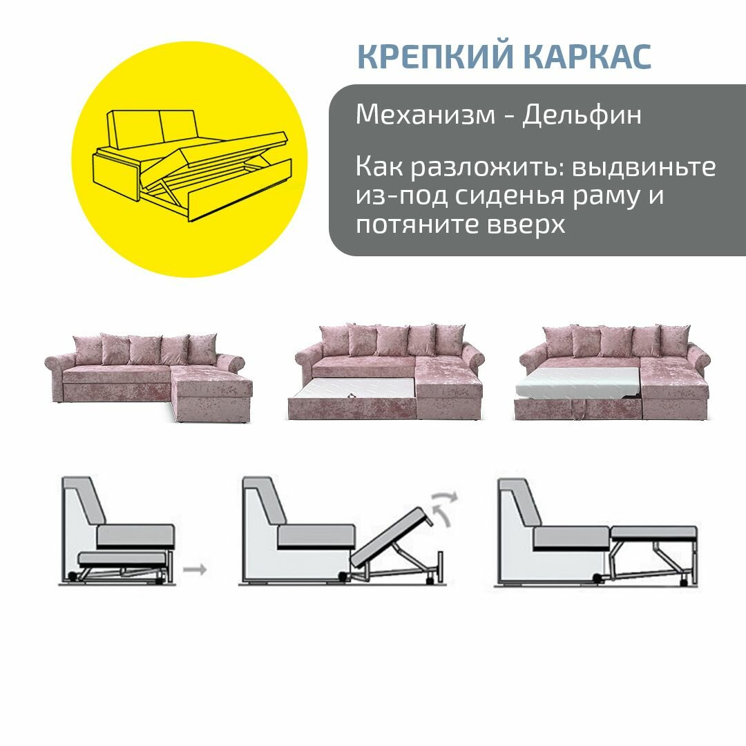 СохранитьУгловой диван AH! DIVAN (АхДиван) Астрид 242х150х71, раскладной диван-кровать, механизм дельфин, розовый плюш интересное:
