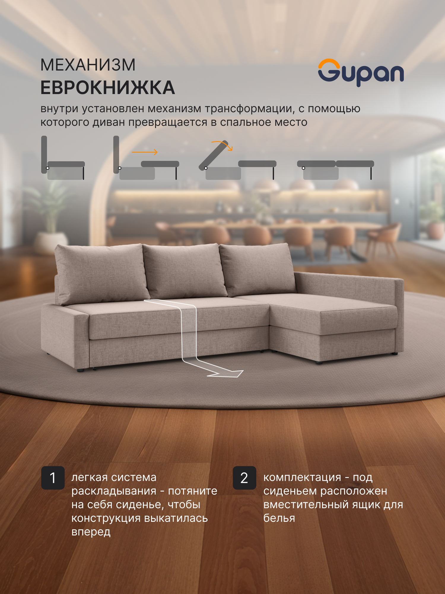 Диван угловой Gupan Фрисби Рогожка Savana Milk, раскладной, механизм дельфин, беспружинный, с ящиком для белья