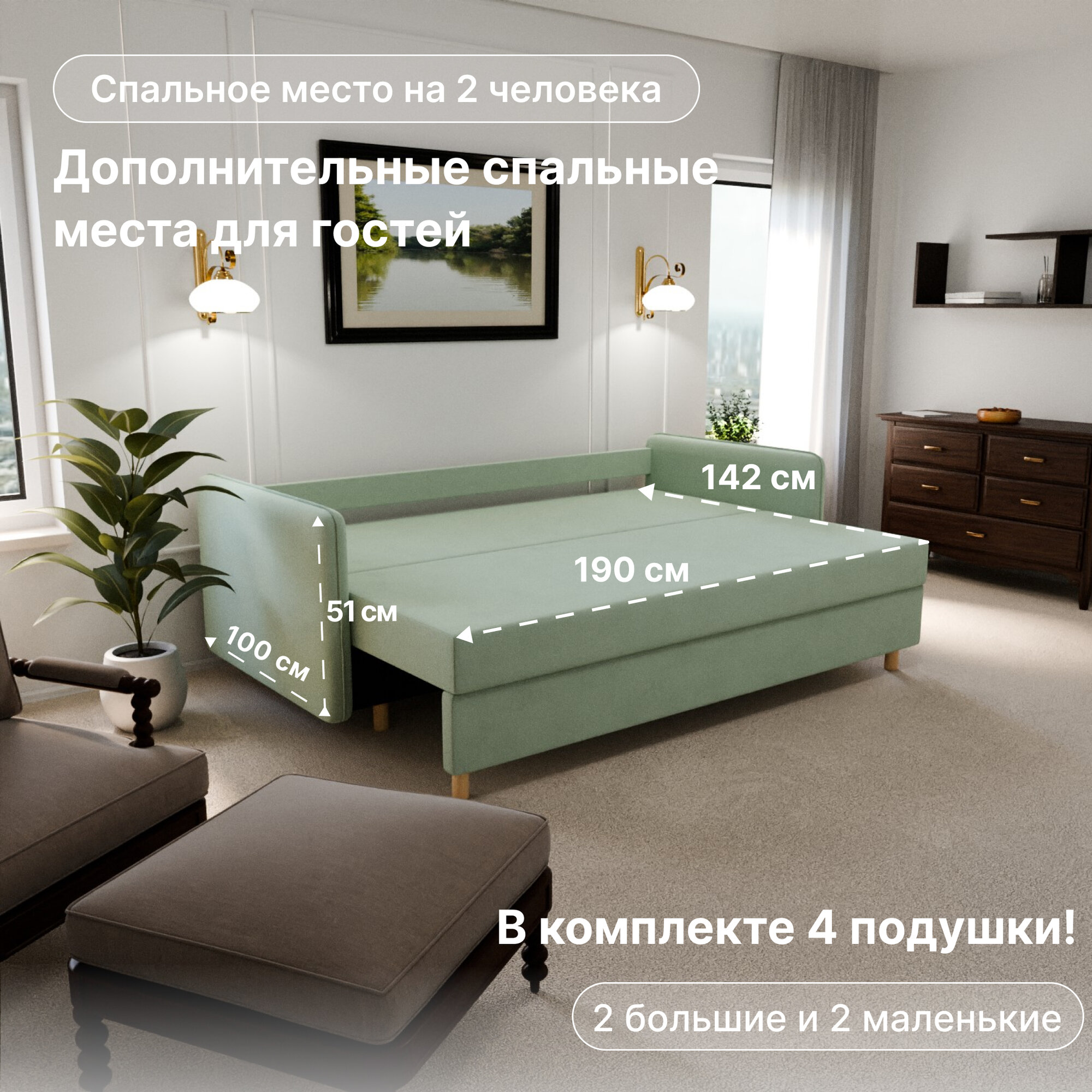 Диван раскладной, "Comforta", НПБ, Велютта люкс 42 размеры 210х80х100, светло-зеленый