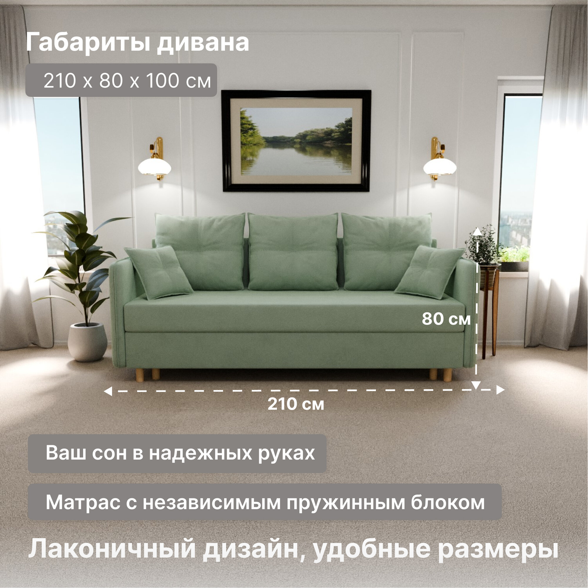 Диван, диван-кровать, диван раскладной "Лотос" НПБ, Велютта люкс 42, размеры 210х80х100, светло-зеленый