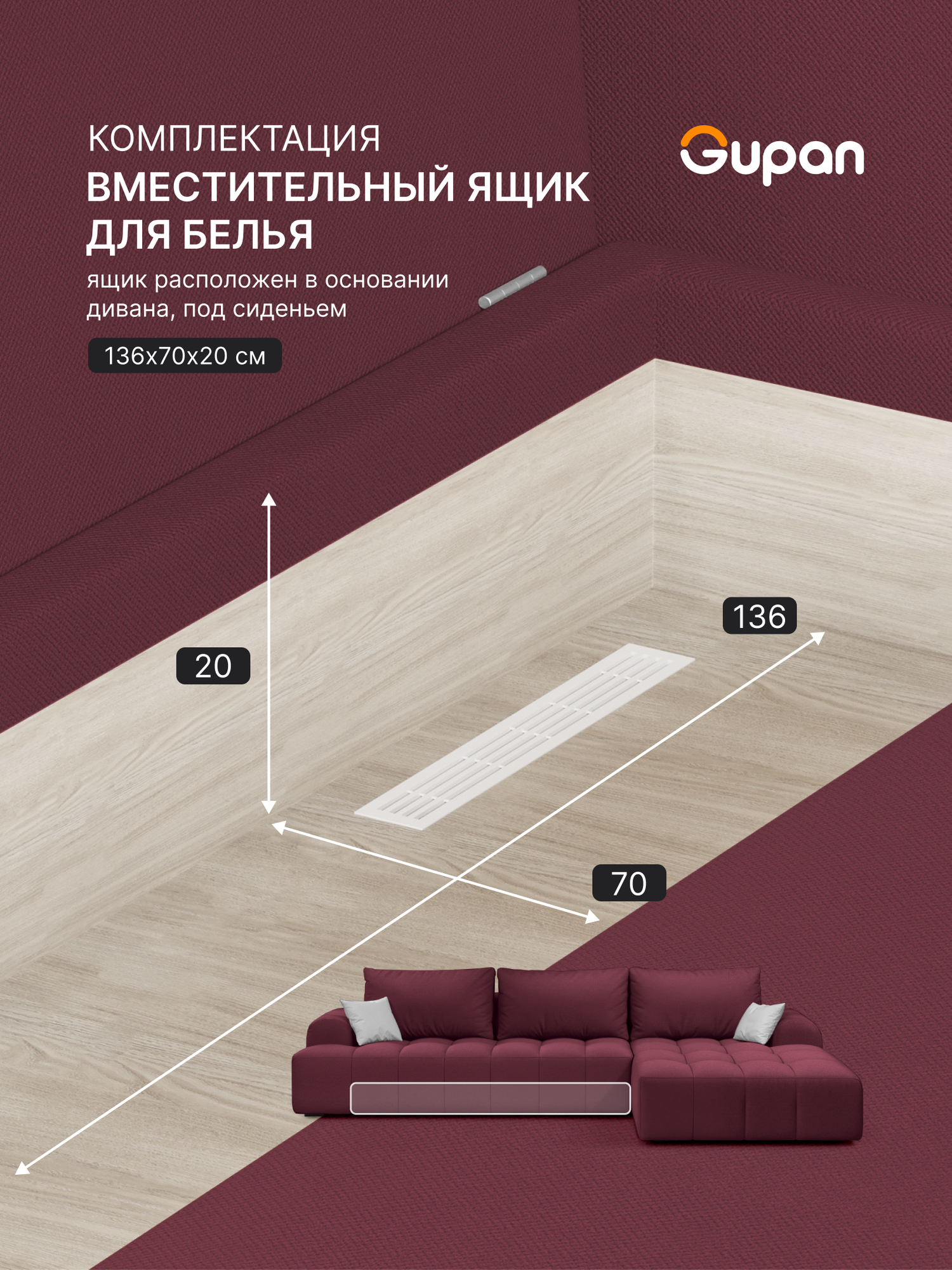 Диван угловой Gupan Lasso Велюр Amigo Berry, диван раскладной, механизм еврокнижка, беспружинный, с ящиком для белья, в гостиную, лофт